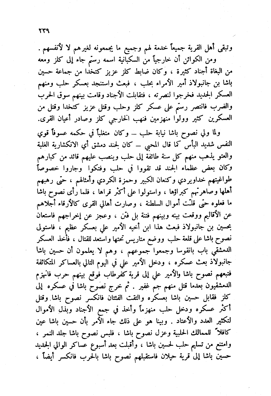 علي بعسكر عظيم، فاستولى نصوح باشا على قلعة حلب ووضع متاريس تحتها واستعد للقتال، فأخذ العسكر الدمشقي باب بانقوسا وجمعوا جموعهم، وهم لا يعلمون أن حسين باشا جانبولاذ بعث عسكره، ودخل الأمير علي في اليوم التالي بالعساكر المتكاثفة فتبعهم نصوح باشا والأمير علي إلى قرية كفر طاب فوقع بينهم حرب فانهزم الدمشقيون بعدما قتل منهم جم غفير. ثم خرج نصوح باشا في عسكره إلى كلز فقابل حسين باشا بعسكره والتقت الفئتان فانكسر نصوح باشا وقتل أكثر عسكره ودخل حلب منهزماً وأخذ في جمع الأجناد وبذل الأموال لتكثير العدد والأعتاد. وبينا هو على ذلك جاء الأمر بأن حسين باشا عين كافلاً للممالك الحلبية وعزل نصوح باشا، فلبس نصوح باشا جلد النمر، وامتنع من تسليم حلب لحسين باشا، وأقبلت بعد أسبوع عساكر الوالي الجديد حسين باشا إلى قرية حيلان فاستقبلهم نصوح باشا بالحرب فانكسر أيضاً،