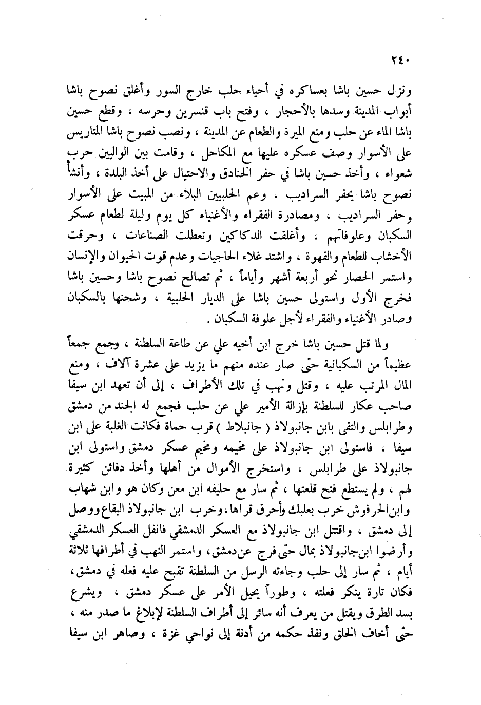ونزل حسين باشا بعساكره في أحياء حلب خارج السور وأغلق نصوح باشا أبواب المدينة وسدها بالأحجار، وفتح باب قنسرين وحرسه، وقطع حسين باشا الماء عن حلب ومنع الميرة والطعام عن المدينة، ونصب نصوح باشا المتاريس على الأسوار وصف عسكره عليها مع المكاحل، وقامت بين الواليين حرب شعواء، وأخذ حسين باشا في حفر الخنادق والاحتيال على أخذ البلدة، وأنشأ نصوح باشا يحفر السراديب، وعم الحلبيين البلاء من المبيت على الأسوار وحفر السراديب، ومصادرة الفقراء والأغنياء كل يوم وليلة لطعام عسكر السكبان وعلوفاتهم، وأغلقت الدكاكين وتعطلت الصناعات، وحرقت الأخشاب للطعام والقهوة، واشتد غلاء الحاجيات وعدم قوت الحيوان والإنسان واستمر الحصار نحو أربعة أشهر وأياماً، ثم تصالح نصوح باشا وحسين باشا فخرج الأول واستولى حسين باشا على الديار الحلبية، وشحنها بالسكبان وصادر الأغنياء والفقراء لأجل علوفة السكبان.