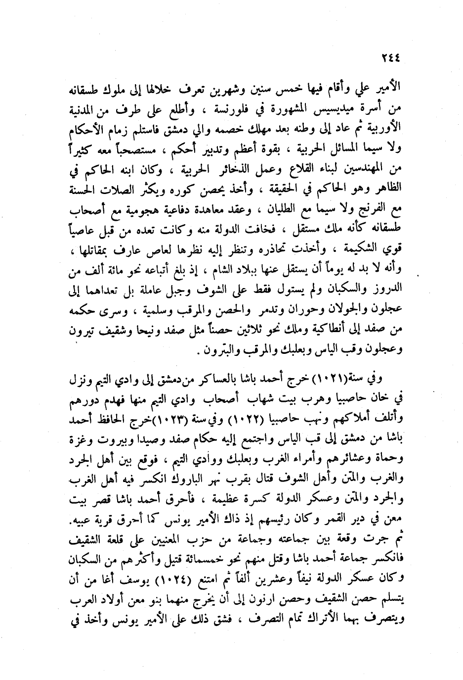 وفي سنة 1021 خرج أحمد باشا بالعساكر من دمشق إلى وادي التيم ونزل في خان حاصبيا وهرب بين شهاب أصحاب وادي التيم منها فهدم دورهم وأتلف أملاكهم ونهب حاصبيا 1022 وفي سنة 1023 خرج الحافظ أحمد باشا من دمشق إلى قب الياس واجتمع إليه حكام صفد وصيدا وبيروت وغزة وحماة وعشائرهم وأمراء الغرب وبعلبك ووادي التيم، فوقع بين أهل الجرد والغرب والمتن وأهل الشوف قتال بقرب نهر الباروك انكسر فيه أهل الغرب والجرد والمتن وعسكر الدولة كسرة عظيمة، فأحرق أحمد باشا قصر بيت معن في دير القمر وكان رئيسهم إذ ذاك الأمير يونس كما أحرق قرية عبيه. ثم جرت وقعة بين جماعته وجماعة من حزب المعنيين على قلعة الشقيف فانكسر جماعة أحمد