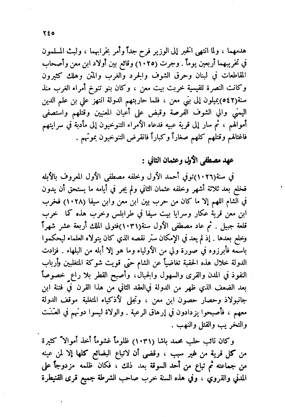 هدمهما، ولما انتهى الخبر إلى الوزير فرح جداً وأمر بخرابهما، ولبث المسلمون في تخريبهما أربعين يوماً. وجرت 1025 وقائع بين أولاد ابن معن وأصحاب المقاطعات في لبنان وحرق الشوف والجرد والغرب والمتن وهلك كثيرون وكانت النصرة للقيسية خربت بيت معن، وكان بنو تنوخ أمراء الغرب منذ سنة 542 يميلون إلى بني معن، فلما حاربتهم الدولة انتهز علي بن علم الدين اليمني والي الشوف الفرصة وقبض على أعيان المعنيين وقتلهم واستصفى أموالهم، ثم سار إلى قرية عبيه فدعاه الأمراء التنوخيون إلى مأدبة في سرايتهم فاغتالهم وقتلهم كلهم صغاراً وكباراً فانقرض التنوخيون بموتهم.