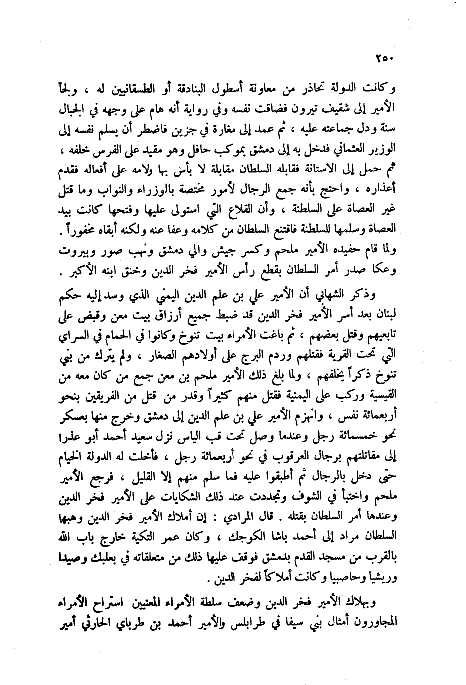 مخفوراً. ولما قام حفيده الأمير ملحم وكسر جيش والي دمشق ونهب صور وبيروت وعكا صدر أمر السلطان بقطع رأس الأمير فخر الدين وخنق ابنه الأكبر.