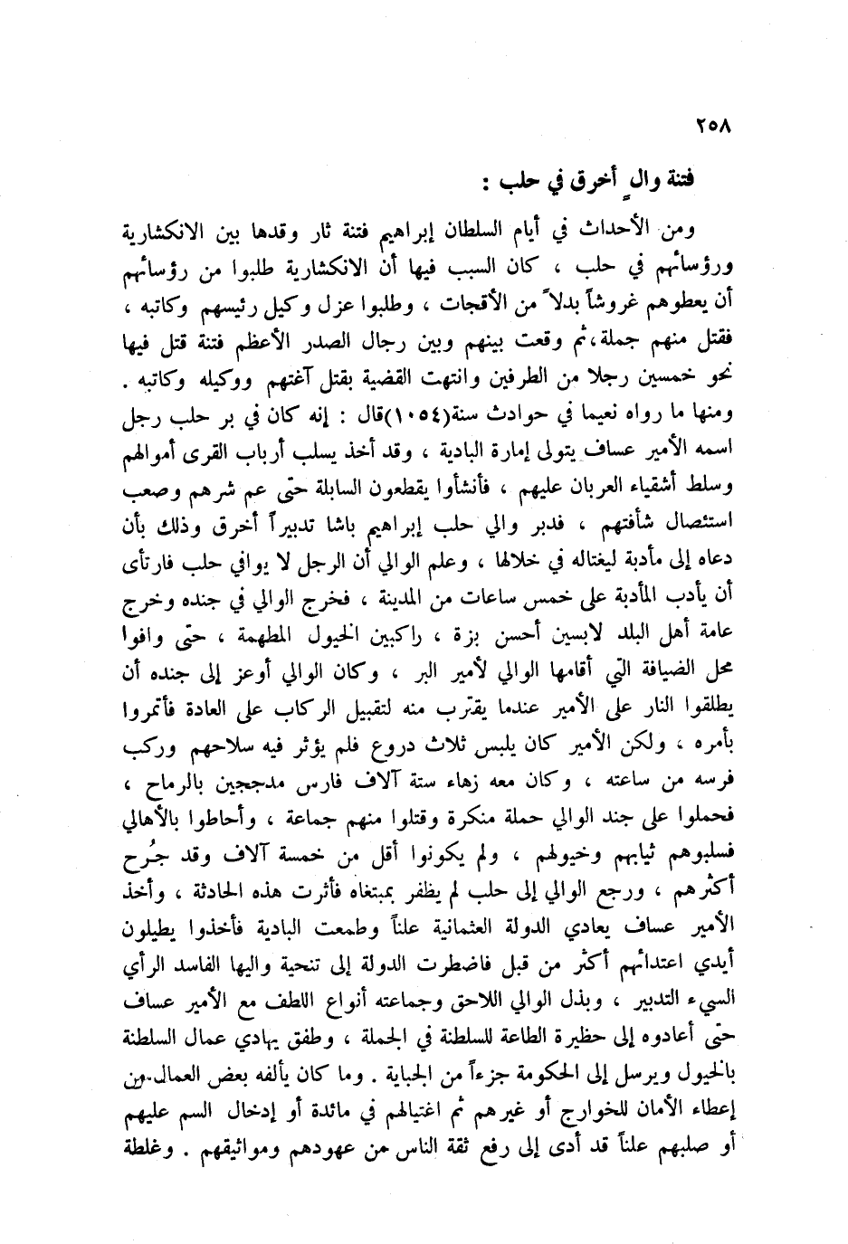 ومن الأحداث في أيام السلطان إبراهيم فتنة ثار وقدها بين الانكشارية ورؤسائهم في حلب، كان السبب فيها أن الانكشارية طلبوا من رؤسائهم أن يعطوهم غروشاً بدلاً من الأقجات، وطلبوا عزل وكيل رئيسهم وكاتبه، فقتل منهم جملة، ثم وقعت بينهم وبين رجال الصدر الأعظم فتنة قتل فيها نحو خمسين رجلاً من الطرفين وانتهت القضية بقتل آغتهم ووكيله وكاتبه. ومنها ما رواه نعيما في حوادث سنة 1054 قال: إنه كان في بر حلب رجل اسمه الأمير عساف يتولى إمارة البادية، وقد أخذ يسلب أرباب القرى أموالهم وسلط أشقياء العربان عليهم، فأنشئوا يقطعون السابلة حتى عم شرهم وصعب استئصال شأفتهم، فدبر والي حلب إبراهيم باشا تدبيراً أخرق وذلك بأن دعاه إلى مأدبة ليغتاله في خلالها، وعلم الوالي أن الرجل لا يوافي حلب فارتأى أن يأدب المأدبة على خمس ساعات من المدينة، فخرج الوالي في جنده وخرج عامة أهل البلد لابسين أحسن بزة، راكبين الخيول المطهمة، حتى وافوا محل الضيافة التي أقامها الوالي لأمير البر، وكان الوالي أوعز إلى جنده أن يطلقوا النار على الأمير عندما يقترب منه لتقبيل الركاب على العادة فأتمروا بأمره، ولكن الأمير كان يلبس ثلاث دروع فلم يؤثر فيه سلاحهم وركب فرسه من ساعته، وكان معه زهاء ستة آلاف فارس مدججين بالرماح، فحملوا على جند الوالي حملة منكرة وقتلوا منهم جماعة، وأحاطوا بالأهالي فسلبوهم ثيابهم وخيولهم، ولم يكونوا أقل من خمسة آلاف وقد جُرح أكثرهم،