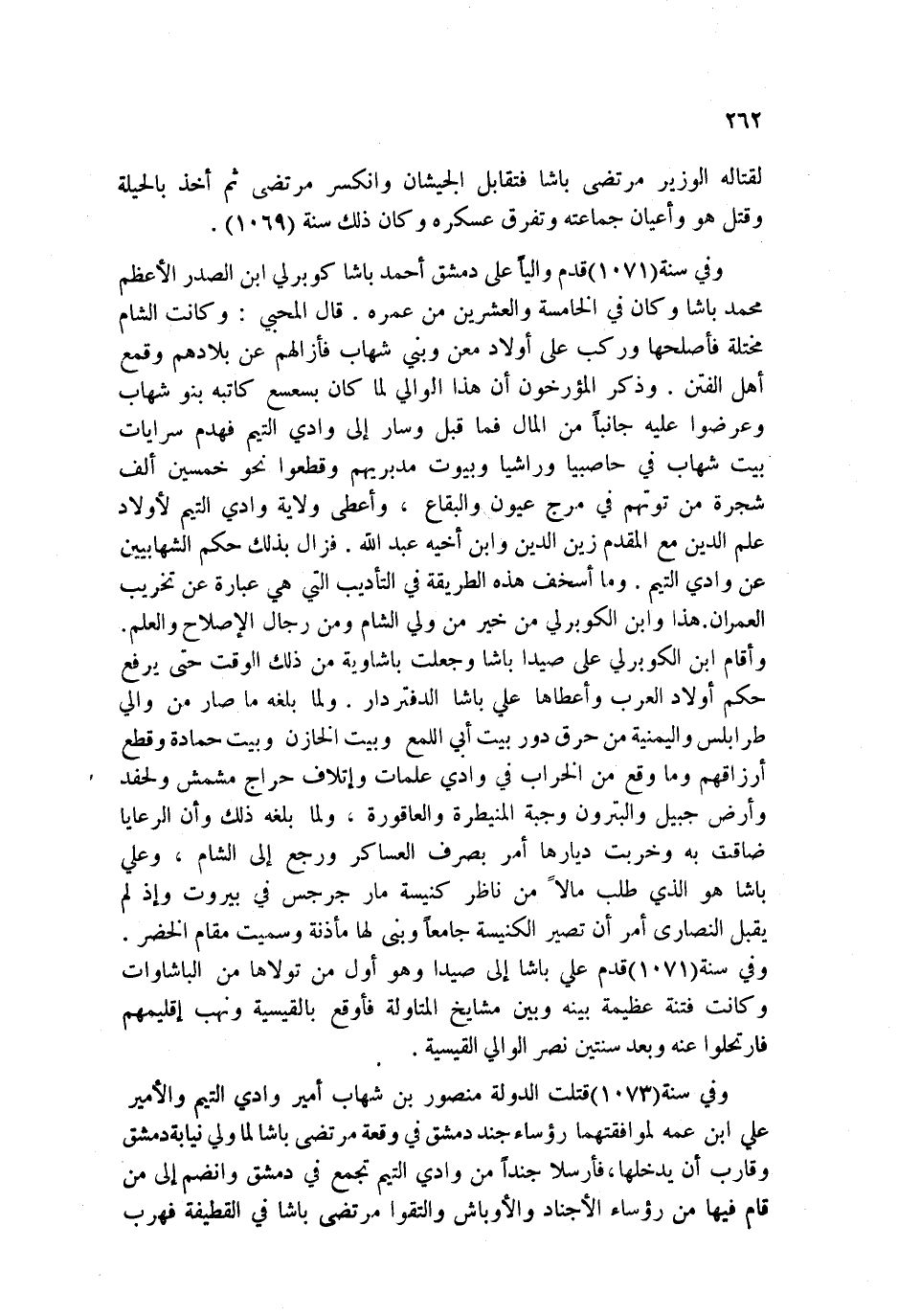 وفي سنة 1071 قدم والياً على دمشق أحمد باشا كوبرلي ابن الصدر الأعظم محمد باشا وكان في الخامسة والعشرين من عمره. قال المحبي: وكانت الشام مختلة فأصلحها وركب على أولاد معن وبني شهاب فأزالهم عن بلادهم وقمع أهل الفتن. وذكر المؤرخون أن هذا الوالي لما كان بسعسع كاتبه بنو شهاب وعرضوا عليه جانباً من المال فما قبل وسار إلى وادي التيم فهدم سرايات بيت شهاب في حاصبيا وراشيا وبيوت مدبريهم وقطعوا نحو خمسين ألف شجرة من توتهم في مرج عيون والبقاع، وأعطى ولاية وادي التيم لأولاد علم الدين مع المقدم زين الدين وابن أخيه عبد الله. فزال بذلك حكم الشهابيين عن وادي التيم. وما أسخف هذه الطريقة في التأديب التي هي عبارة عن تخريب العمران. هذا وابن الكوبرلي من خير من ولي الشام ومن رجال الإصلاح والعلم. وأقام ابن الكوبرلي على صيدا باشا وجعلت باشاوية من ذلك الوقت حتى يرفع حكم أولاد العرب وأعطاها علي باشا الدفتردار. ولما بلغه ما صار من والي طرابلس واليمنية من حرق دور بيت أبي اللمع وبيت الخازن وبيت حمادة وقطع أرزاقهم وما وقع من الخراب في وادي علمات وإتلاف حراج مشمش ولحفد وأرض جبيل والبترون وجبة المنيطرة والعاقورة، ولما بلغه ذلك وأن الرعايا ضاقت به وخربت ديارها أمر بصرف العساكر ورجع إلى الشام، وعلي باشا هو الذي طلب مالاً من ناظر كنيسة مار
