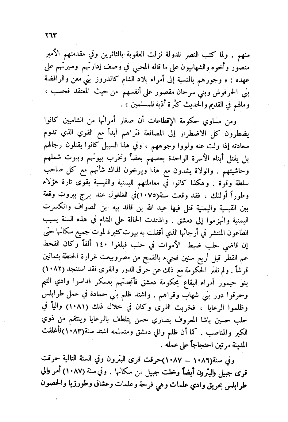 منهم. ولما كتب النصر للدولة نزلت العقوبة بالثائرين وفي مقدمتهم الأمير منصور وأخوه والشهابيون على ما قاله المحبي في وصف إدارتهم وسيرتهم على عهده: وجورهم بالنسبة إلى أمراء بلاد الشام كالدروز بني معن والرافضة بني الحرفوش وبني سرحان مقصور على أنفسهم من حيث المعتقد فحسب، ومالهم في القديم والحديث كثرة أذية للمسلمين.