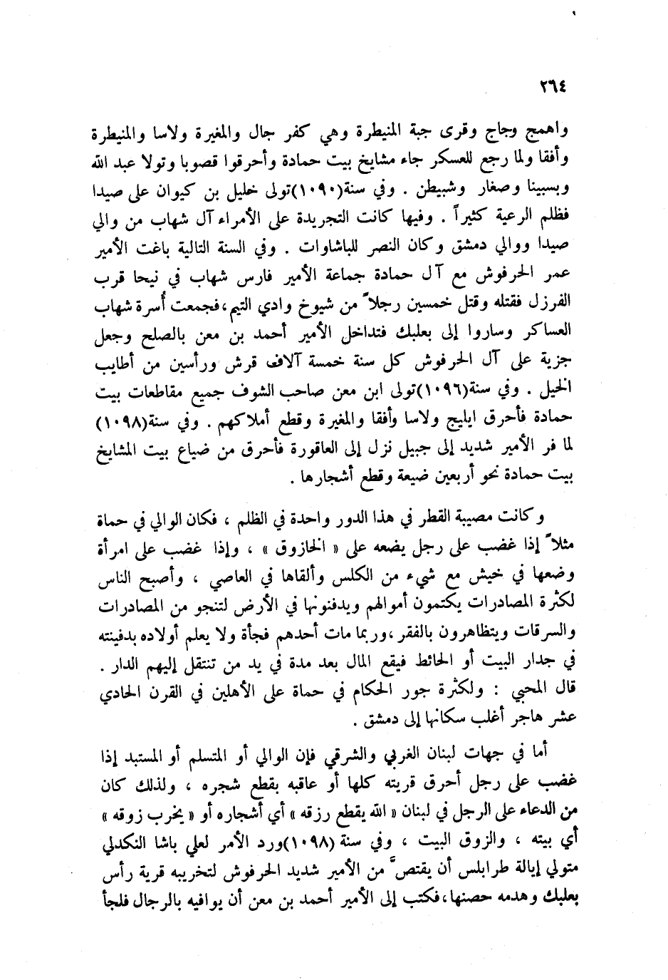 واهمج وجاج وقرى جبة المنيطرة وهي كفر جال والمغيرة ولاسا والمنيطرة وأفقا ولما رجع للعسكر جاء مشايخ بيت حمادة وأحرقوا قصوبا وتولا عبد الله وبسبينا وصغار وشبيطن. وفي سنة 1090 تولى خليل بن كيوان على صيدا فظلم الرعية كثيراً. وفيها كانت التجريدة على الأمراء آل شهاب من والي صيدا ووالي دمشق وكان النصر للباشاوات. وفي السنة التالية باغت الأمير عمر الحرفوش مع آل حمادة جماعة الأمير فارس شهاب في نيحا قرب الفرزل فقتله وقتل خمسين رجلاً من شيوخ وادي التيم، فجمعت أسرة شهاب العساكر وساروا إلى بعلبك فتداخل الأمير أحمد بن معن بالصلح وجعل جزية على آل الحرفوش كل سنة خمسة آلاف قرش ورأسين من أطايب الخيل. وفي سنة 1096 تولى ابن معن صاحب الشوف جميع مقاطعات بيت حمادة فأحرق ايليج ولاسا وأفقا والمغيرة وقطع أملاكهم. وفي سنة 1098 لما وفر الأمير شديد إلى جبيل نزل إلى العاقورة فأحرق من