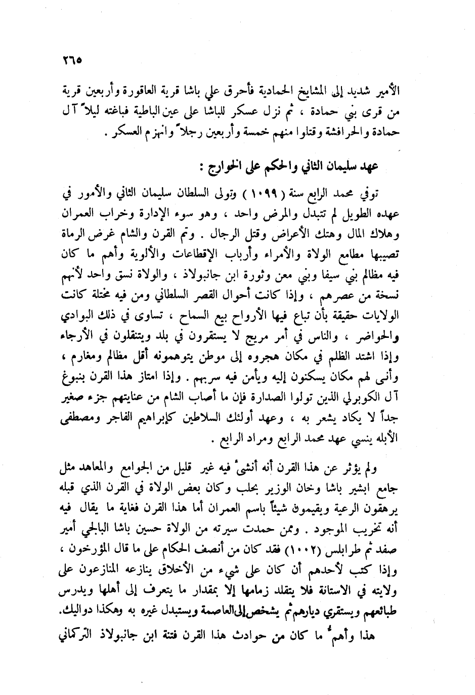 الولاة والأمراء وأرباب الإقطاعات والألوية وأهم ما كان فيه مظالم بني سيفا وبني معن وثورة ابن جانبولاذ، والولاة نسق واحد لأنهم نسخة من عصرهم، وإذا كانت أحوال القصر السلطاني ومن فيه مختلة كانت الولايات حقيقة بأن تباع فيها الأرواح بيع السماح، تساوى في ذلك البوادي والحواضر، والناس في أمر مريج لا يستقرون في بلد ويتنقلون في الأرجاء وإذا اشتد الظلم في مكان هجروه إلى موطن يتوهمونه أقل مظالم ومغارم، وأنى لهم مكان يسكنون إليه ويأمن فيه سربهم. وإذا امتاز هذا القرن بنبوغ آل الكوبرلي الذين تولوا الصدارة فإن ما أصاب الشام من عنايتهم جزء صغير جداً لا يكاد يشعر به، وعهد أولئك السلاطين كإبراهيم الفاجر ومصطفى الأبله ينسي عهد محمد الرابع ومراد الرابع.