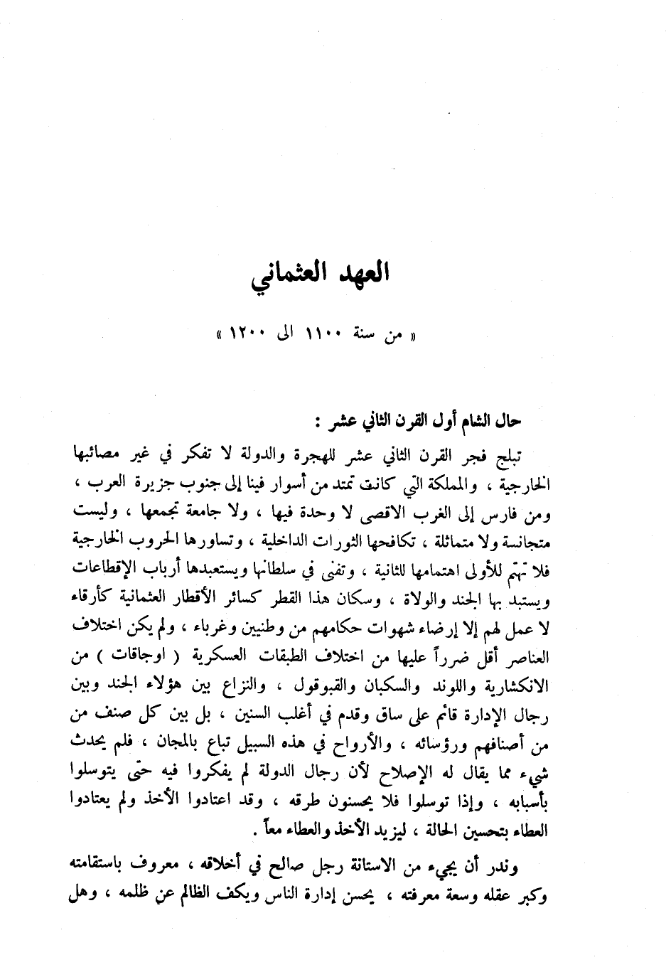 تبلج فجر القرن الثاني عشر للهجرة والدولة لا تفكر في غير مصائبها الخارجية، والمملكة التي كانت تمتد من أسوار فينا إلى جنوب جزيرة العرب، ومن فارس إلى الغرب الأقصى لا وحدة فيها، ولا جامعة تجمعها، وليست متجانسة ولا متماثلة، تكافحها الثورات الداخلية، وتساورها الحروب الخارجية فلا تهتم للأولى اهتمامها للثانية، وتفني في سلطانها ويستعبدها أرباب الأقطاعات ويستبد بها الجند والولاة، وسكان هذا القطر كسائر الأقطار العثمانية كأرقاء لا عمل لهم إلا إرضاء شهوات حكامهم من وطنيين وغرباء، ولم يكن اختلاف العناصر أقل ضرراً عليها من اختلاف الطبقات العسكرية أوجاقات من الانكشارية واللوند والسكبان والقبوقول، والنزاع بين هؤلاء الجند وبين رجال الإدارة قائم على ساق وقدم في أغلب السنين، بل بين كل صنف من أصنافهم ورؤسائه، والأرواح في هذه السبيل تباع بالمجان، فلم يحدث شيء مما يقال له الإصلاح لأن رجال الدولة لم يفكروا فيه حتى يتوسلوا بأسبابه وإذا توسلوا فلا يحسنون طرقه، وقد اعتادوا الأخذ ولم يعتادوا العطاء بتحسين الحالة، ليزيد الأخذ والعطاء معاً.