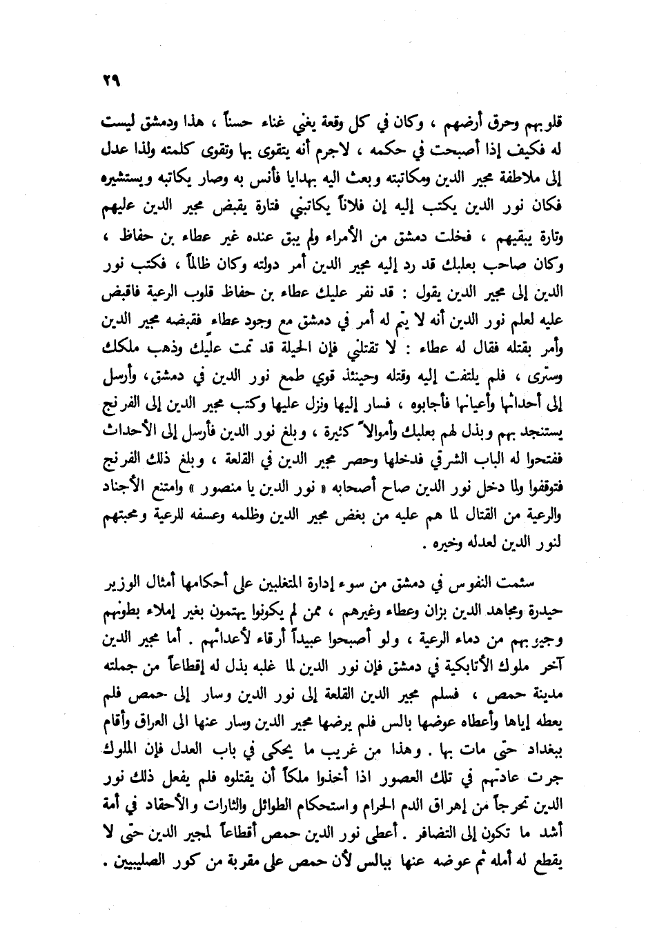 فكيف إذا أصبحت في حكمه، لا جرم أنه يتقوى بها وتقوى كلمته ولذا عدل إلى ملاطفة مجير الدين ومكاتبته وبعث إليه بهدايا فأنس به وصار يكاتبه ويستشيره فكان نور الدين يكتب إليه إن فلاناً يكاتبني فتارة يقبض مجير الدين عليهم وتارة يبقيهم، فخلت دمشق من الأمراء ولم يبق عنده غير عطاء بن حفاظ، وكان صاحب بعلبك قد رد إليه مجير الدين أمر دولته وكان ظالماً، فكتب نور الدين إلى مجير الدين يقول: قد نفر عليك عطاء بن حفاظ قلوب الرعية فاقبض عليه لعلم نور الدين أنه لا يتم له أمر في دمشق مع وجود عطاء فقبضه مجير الدين وأمر بقتله فقال له عطاء: لا تقتلني فإن الحيلة قد تمت عليك وذهب ملكك وسترى، فلم يلتفت إليه وقتله وحينئذ قوي طمع نور الدين في دمشق، وأرسل إلى أحداثها وأعيانها فأجابوه، فسار إليها ونزل عليها وكتب مجير الدين إلى الفرنج يستنجد بهم وبذل لهم بعلبك وأموالاً كثيرة، وبلغ نور الدين فأرسل إلى الأحداث ففتحوا له الباب الشرقي فدخلها وحصر مجير الدين في القلعة، وبلغ ذلك الفرنج فتوقفوا ولما دخل نور الدين صاح أصحابه نور الدين يا منصور وامتنع الأجناد والرعية من القتال لما هم عليه من بغض مجير الدين وظلمه وعسفه للرعية ومحبتهم لنور الدين لعدله وخيره.