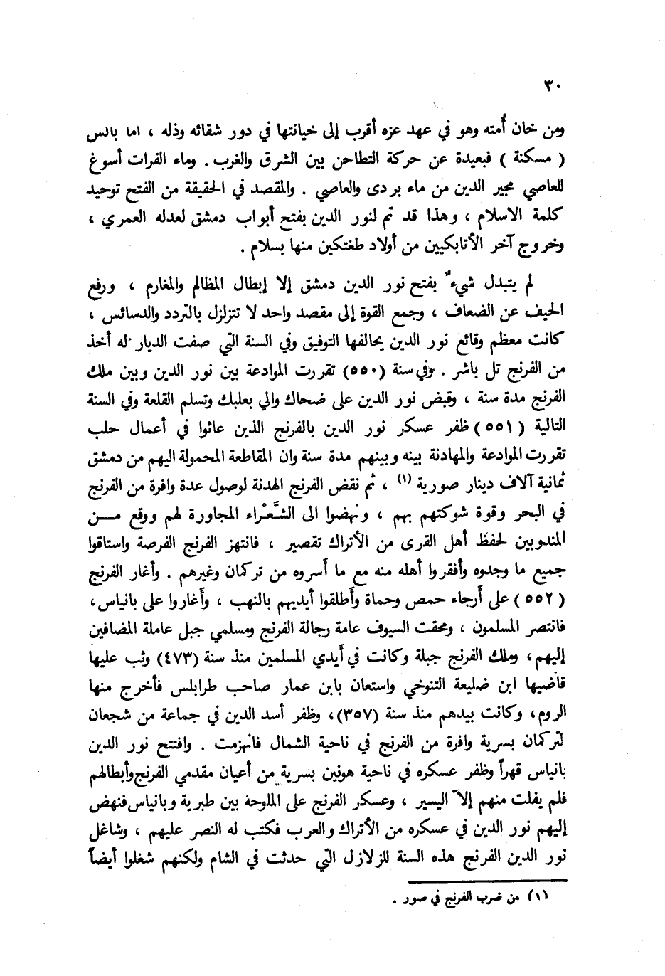 ومن خان أمته وهو في عهد عزه أقرب إلى خيانتها في دور شقائه وذله، أما بالس مسكنة فبعيدة عن حركة التطاحن بين الشرق والغرب. وماء الفرات أسوغ للعاصي مجير الدين من ماء بردى والعاصي. والمقصد في الحقيقة من الفتح توحيد كلمة الإسلام، وهذا قد تم لنور الدين بفتح أبواب دمشق لعدله العمري، وخروج آخر الأتابكيين من أولاد طغتكين منها بسلام.