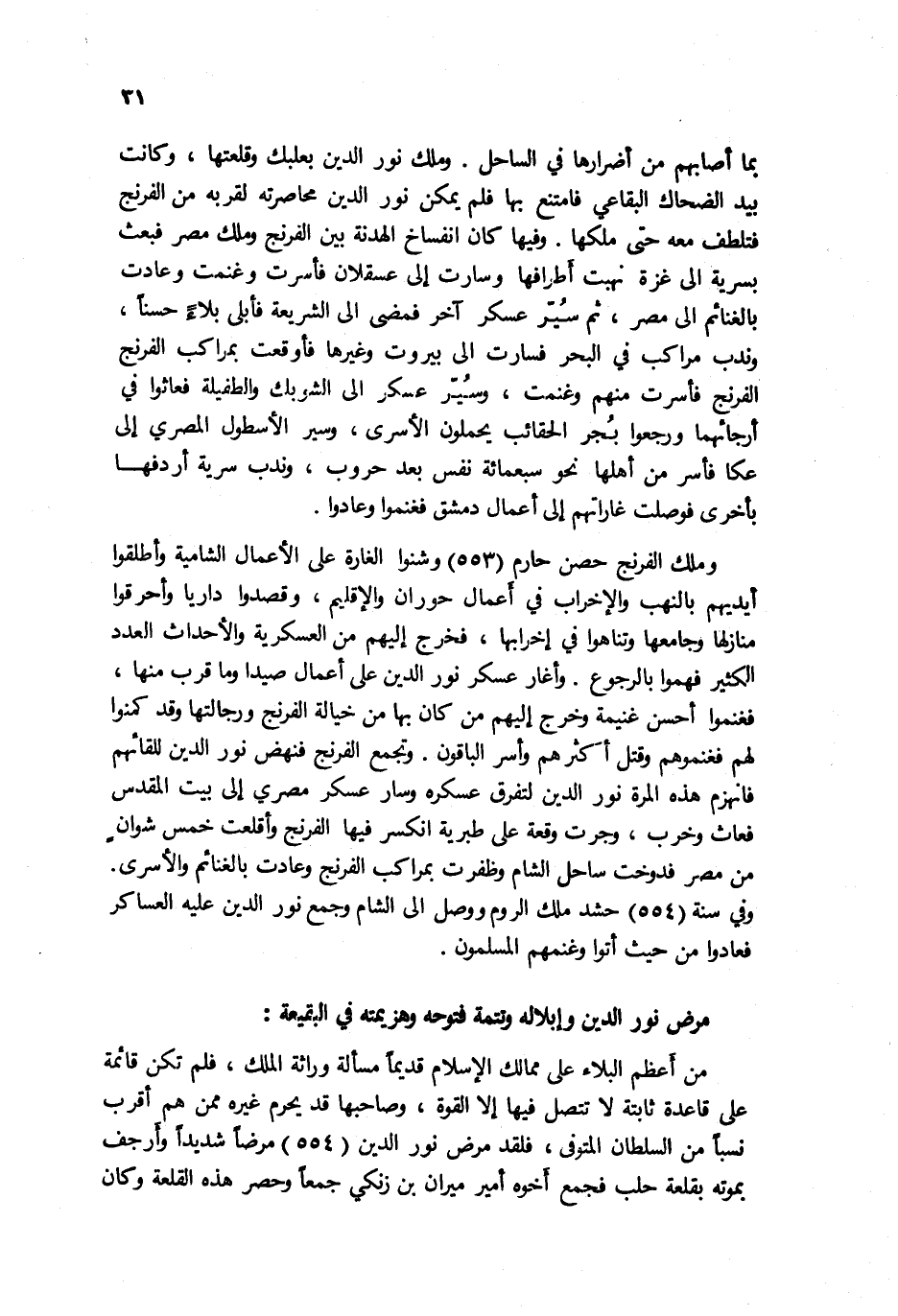 فغنموا أحسن غنيمة وخرج إليهم من كان بها من خيالة الفرنج ورجالتها وقد كمنوا لهم فغنموهم وقتل أكثرهم وأسر الباقون. وتجمع الفرنج فنهض نور الدين للقائهم فانهزم هذه المرة نور الدين لتفرق عسكره وسار عسكر مصري إلى بيت المقدس فعاث وخرب، وجرت وقعة على طبرية انكسر فيها الفرنج وأقلعت خمس شوان من مصر فدوخت ساحل الشام وظفرت بمراكب الفرنج وعادت بالغنائم والأسرى. وفي سنة 554 حشد ملك الروم ووصل إلى الشام وجمع نور الدين عليه العساكر فعادوا من حيث أتوا وغنمهم المسلمون.