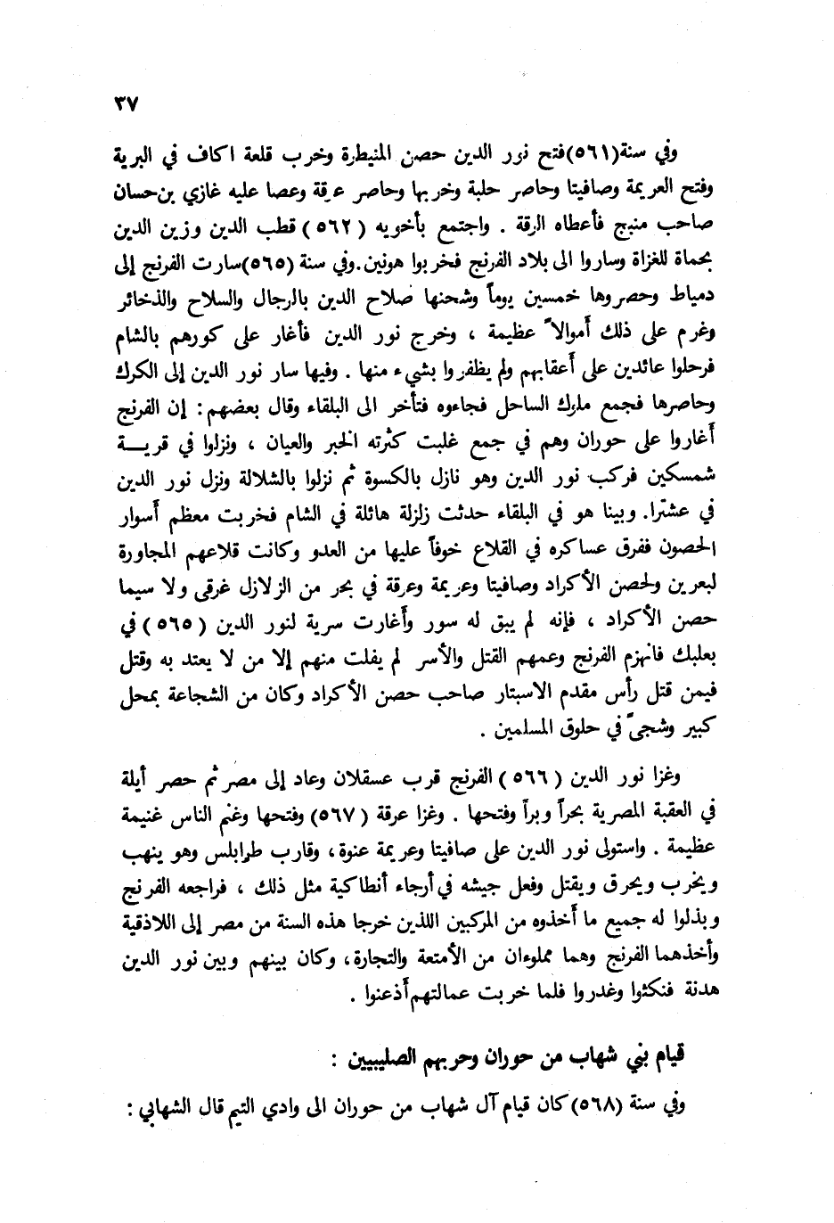 وفي سنة 561 فتح نور الدين حصن المنيطرة وخرب قلعة اكاف في البرية وفتح العريمة وصافيتا وحاصر حلبة وخربها وحاصر عرقة وعصا عليه غازي بن حسان صاحب منبج فأعطاه الرقة. واجتمع بأخويه 562 قطب الدين وزين الدين بحماة للغزاة وساروا إلى بلاد الفرنج فخربوا هونين. وفي سنة 565 سارت الفرنج إلى دمياط وحصروها خمسين يوماً وشحنها صلاح الدين بالرجال والسلاح والذخائر وغرم على ذلك أموالاً عظيمة، وخرج نور الدين فأغار على كورهم بالشام فرحلوا عائدين على أعقابهم ولم يظفروا بشيء منها. وفيها سار نور الدين إلى الكرك وحاصرها فجمع ملوك الساحل فجاءوه فتأخر إلى البلقاء وقال بعضهم: إن الفرنج أغاروا على حوران وهم في جمع غلبت كثرته الخبر والعيان، ونزلوا في قرية شمسكين فركب نور الدين وهو نازل بالكسوة ثم نزلوا بالشلالة ونزل نور الدين في عشترا. وبينا هو في البلقاء حدثت زلزلة هائلة في الشام فخربت معظم أسوار الحصون ففرق عساكره في القلاع خوفاً عليها من العدو وكانت قلاعهم المجاورة لبعرين ولحصن الأكراد وصافيتا وعريمة وعرقة في
