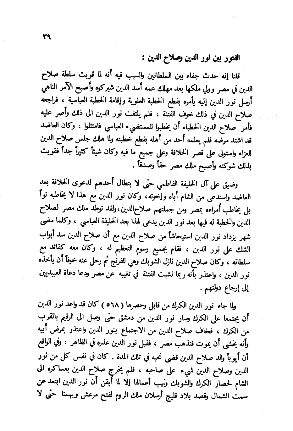 صلاح الدين في ذلك خوف الفتنة، فلم يلتفت نور الدين إلى ذلك وأصر عليه فأمر صلاح الدين الخطباء أن يخطبوا للمستضيئ العباسي فامتثلوا، وكان العاضد قد اشتد مرضه فلم يعلمه أحد من أهله بقطع خطبته ولما هلك جلس صلاح الدين للعزاء واستولى على قصر الخلافة وعلى جميع ما فيه وكان شيئاً كثيراً جداً فقويت بذلك شوكته وأصبح ملك مصر حقاً وصدقاً.