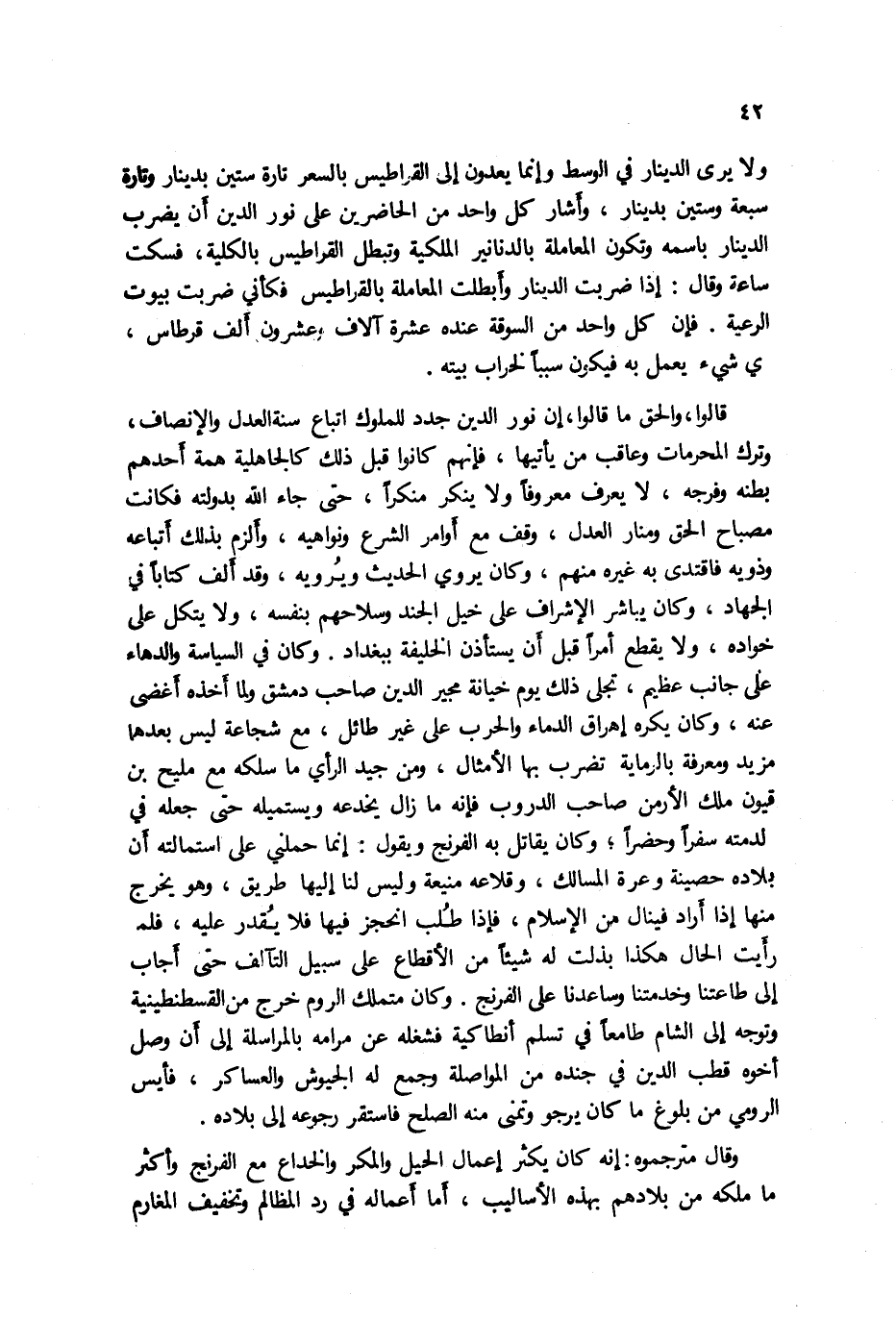 ولا يرى الدينار في الوسط وإنما يعدون إلى القراطيس بالسعر تارة ستين بدينار وتارة سبعة وستين بدينار، وأشار كل واحد من الحاضرين على نور الدين أن يضرب الدينار باسمه وتكون المعاملة بالدنانير الملكية وتبطل القراطيس بالكلية، فسكت ساعة وقال: إذا ضربت الدينار وأبطلت المعاملة بالقراطيس فكأني ضربت بيوت الرعية. فإن كل واحد من السوقة عنده عشرة آلاف وعشرون ألف قرطاس، أي شيء يعمل به فيكون سبباً لخراب بيته.