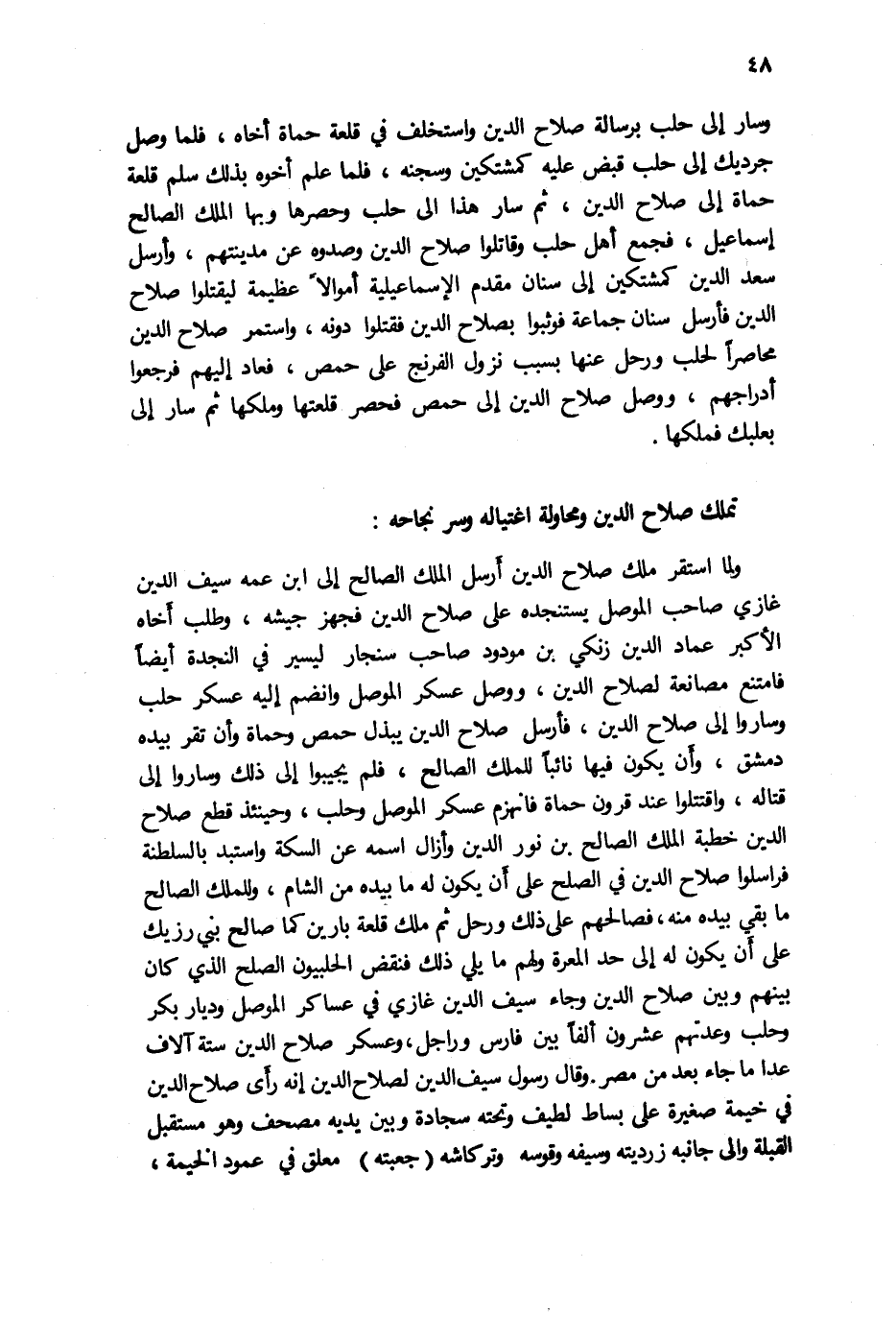 وسار إلى حلب برسالة صلاح الدين واستخلف في قلعة حماة أخاه، فلما وصل جرديك إلى حلب قبض عليه كمشتكين وسجنه، فلما علم أخوه بذلك سلم قلعة حماة إلى صلاح الدين، ثم سار هذا إلى حلب وحصرها وبها الملك الصالح إسماعيل، فجمع أهل حلب وقاتلوا صلاح الدين وصدوه عن مدينتهم، وأرسل سعد الدين كمشتكين إلى سنان مقدم الإسماعيلية أموالاً عظيمة ليقتلوا صلاح الدين فأرسل سنان جماعة فوثبوا بصلاح الدين فقتلوا دونه، واستمر صلاح الدين محاصراً لحلب ورحل عنها بسبب نزول الفرنج على حمص، فعاد إليهم فرجعوا أدراجهم، ووصل صلاح الدين إلى حمص فحصر قلعتها وملكها ثم سار إلى بعلبك فملكها.