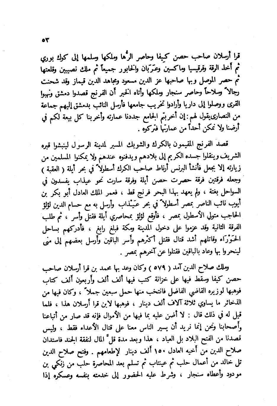 وملك صلاح الدين آمد 579 وكان وعد بها محمد بن قرا أرسلان صاحب حصن كيفا وسقط فيها على خزانة كتب فيها ألف ألف وأربعون ألف كتاب فوهبها لوزيره القاضي الفاضل فانتخب منها حمل سبعين جملاً، وكان فيها من الذخائر ما يساوي ثلاثة آلاف ألف دينار، فوهبها لابن قرا أرسلان هذا، فلما قيل له في ذلك قال: لا أضن عليه بما فيها من الأموال فإنه قد صار من أتباعنا وأصحابنا ونحن إنما نريد أن يسير الناس معنا على قتال الأعداء فقط، وليس قصدنا من الفتح البلاد بل العباد، هذا وبعد مدة قلّ المال لنفقة الجند فاستدان صلاح الدين من أخيه العادل 150 ألف دينار لإطعامهم. وفتح صلاح الدين تل خالد من أعمال حلب ثم عينتاب ثم تسلم بعد المحاصرة حلب من زنكي بن مودود وأعطاه سنجار، وشرط عليه الحضور إلى خدمته بنفسه وعسكره إذا