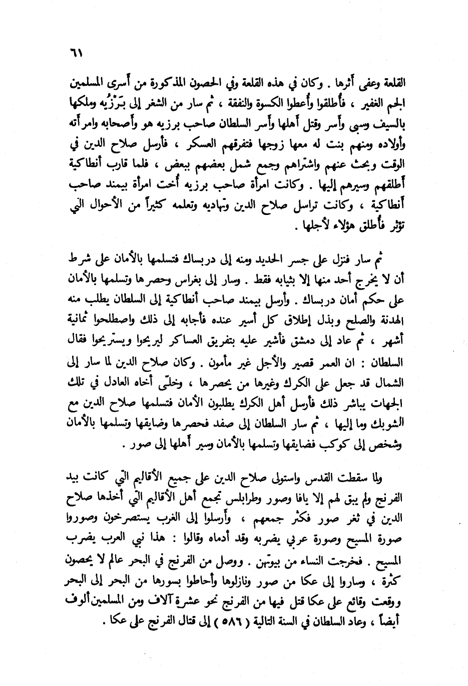 القلعة وعفى أثرها. وكان في هذه القلعة وفي الحصون المذكورة من أسرى المسلمين الجم الغفير، فأُطلقوا وأُعطوا الكسوة والنفقة، ثم سار من الشغر إلى بَرْزُيه وملكها بالسيف وسبى وأسر وقتل أهلها وأسر السلطان صاحب برزيه هو وأصحابه وامرأته وأولاده ومنهم بنت له معها زوجها فتفرقهم العسكر، فأرسل صلاح الدين في الوقت وبحث عنهم واشتراهم وجمع شمل بعضهم ببعض، فلما قارب إنطاكية أطلقهم وسيرهم إليها. وكانت امرأة صاحب برزيه أخت امرأة بيمند صاحب إنطاكية، وكانت تراسل صلاح الدين وتهاديه وتعلمه كثيراً من الأحوال التي تؤثر فأُطلق هؤلاء لأجلها.