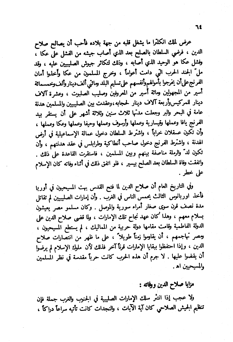 وفي التاريخ العام أن صلاح الدين لما فتح القدس بهت المسيحيون في أوربا فأخذ أوربانوس الثالث يحمس الناس في الغرب. وأن إمارات الصليبيين لم تقاتل مدة نصف قرن سوى صغار أمراء سورية والموصل. وكان مسلمو مصر يعيشون بسلام معهم، وهذا كان عهد نجاح تلك الإمارات، ولما قضى صلاح الدين على الدولة الفاطمية وقامت مقامها دولة حربية من المماليك، لم يستطع المسيحيون، ومصر تهاجمهم، أن يقاوموا زمناً طويلاً، على ما ظهر من انتصارات صلاح الدين، وإذا احتفظوا ببقايا الإمارات قرناً آخر فذلك لأن ملوك الإسلام لم يرضوا أن يقضوا عليها. لا جرم أن هذه الحرب كانت حرباً مقدسة في نظر المسلمين والمسيحيين اه.
