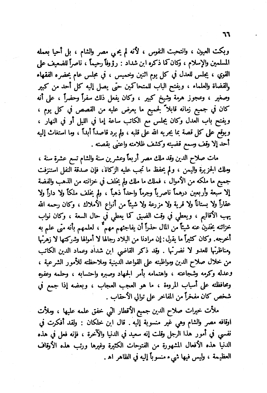 زهرتها ومناظرتها للعدو لا نضرتها. وقد ذكر القاضي ابن شداد وعماد الدين الكاتب من خلال صلاح الدين ومواظبته على القواعد الدينية وملاحظته للأمور الشرعية، وعدله وكرمه وشجاعته، واهتمامه بأمر الجهاد وصبره واحتسابه، وحلمه وعفوه ومحافظته على أسباب المروءة، ما هو العجب العجاب، وبعضه إذا جمع في شخص كان مفخراً من المفاخر على توالي الأحقاب.