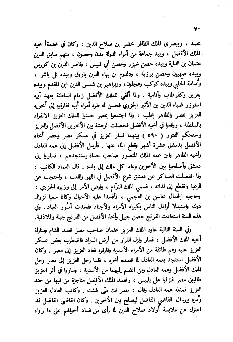 خدمة أخيه الملك الأفضل، وبيد جماعة من أمراء الدولة مدن وحصون، منهم سابق الدين عثمان بن الداية وبيده حصن شيزر وحصن أبي قبيس، وناصر الدين بن كورس وبيده صهيون وحصن برزية، ودلدرم بن بهاء الدين ياروق وبيده تل باشر، وأسامة الحلبي وبيده كوكب وعجلون، وإبراهيم بن شمس الدين ابن المقدم وبيده بعرين وكفرطاب وأفامية. ولما ألقي للملك الأفضل زمام السلطنة بعهد أبيه استوزر ضياء الدين بن الأثير الجزري فحسن له طرد أمراء أبيه ففارقوه إلى أخويه العزيز بمصر والظاهر بحلب، ولما اجتمعوا بمصر حسنوا للملك العزيز الانفراد بالسلطنة، ووقعوا في أخيه الأفضل فحصلت الوحشة بين الأخوين الأفضل والعزيز واستحكم الفتور 590 بينهما فسار العزيز في عسكر مصر وحصر أخاه الأفضل بدمشق عشرة أشهر وقطع الماء عنها. فأرسل الأفضل إلى عمه العادل وأخيه الظاهر وابن عمه الملك المنصور صاحب حماة يستنجدهم، فساروا إلى دمشق وأصلحوا بين الأخوين وعاد كل ملك إلى بلده. قال العماد الكاتب: ولما انفصلت العساكر عن دمشق شرع الأفضل في اللهو واللعب، واحتجب عن الرعية وانقطع إلى لذاته، فسمي الملك النوّام، وفوض الأمر إلى وزيره الجزري، وحاجبه الجمال محاسن بن العجمي، فأفسدا عليه الأحوال وكانا سعيا لزوال دولته واستبدلا أراذل الناس بكبراء الأمراء والأجناد ففسدت أمور العباد. وفي هذه السنة استعادت الفرنج حصن جبيل وأخذ الأفضل من الفرنج جبلة واللاذقية.