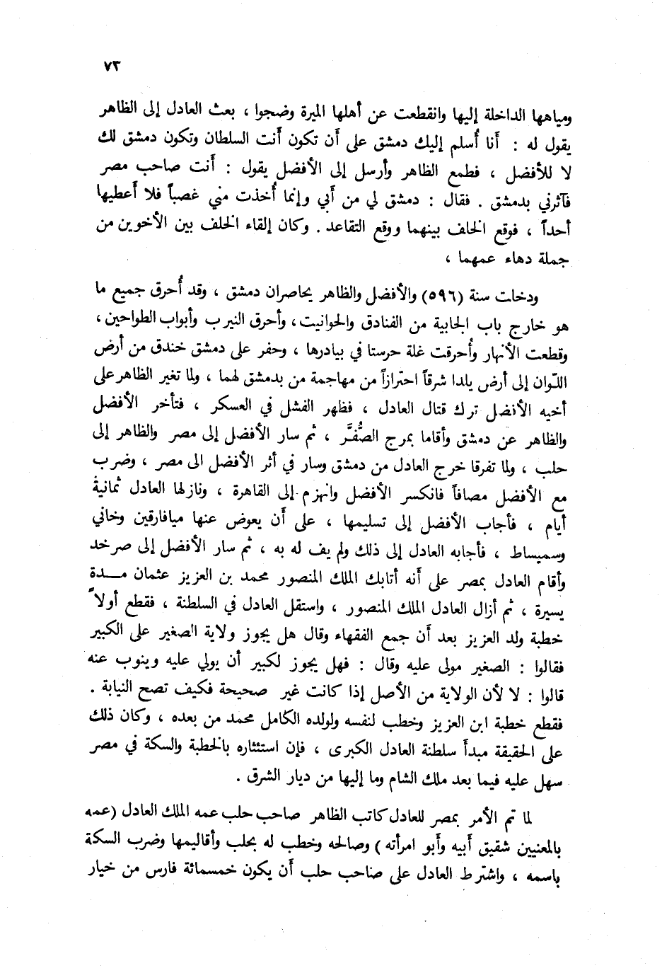 ودخلت سنة 596 والأفضل والظاهر يحاصران دمشق، وقد أحرق جميع ما هو خارج باب الجابية من الفنادق والحوانيت، وأحرق النيرب وأبواب الطواحين،