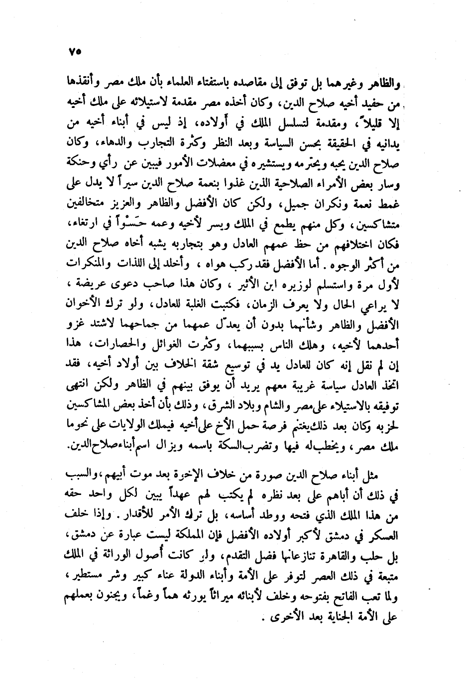 مثل أبناء صلاح الدين صورة من خلاف الإخوة بعد موت أبيهم، والسبب في ذلك أن أباهم على بعد نظره لم يكتب لهم عهداً يبين لكل واحد حقه من هذا الملك الذي فتحه ووطد أساسه، بل ترك الأمر للأقدار. وإذا خلف العسكر في دمشق لأكبر أولاده الأفضل فإن المملكة ليست عبارة عن دمشق، بل حلب والقاهرة تنازعانها فضل التقدم، ولو كانت أصول الوراثة في الملك متبعة في ذلك العصر لتوفر على الأمة وأبناء الدولة عناء كبير وشر مستطير، ولما تعب الفتح بفتوحه وخلف لأبنائه ميراثاً يورثه هماً وغماً، ويجنون بعملهم على الأمة الجناية بعد الأخرى.