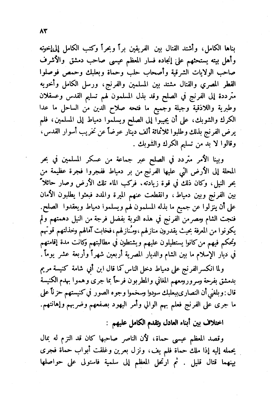 بناها الكامل، وأشتد القتال بين الفريقين براً وبحراً وكتب الكامل إلى اخوته وأهل بيته يستحثهم على إنجاده فسار المعظم عيسى صاحب دمشق والأشرف صاحب الولايات الشرقية وأصحاب حلب وحماة وبعلبك وحمص فوصلوا القطر المصري والقتال مشتد بين المسلمين والفرنج، ورسل الكامل وأخويه مترددة إلى الفرنج في الصلح وقد بذل المسلمون لهم تسليم القدس وعسقلان وطبرية واللاذقية وجبلة