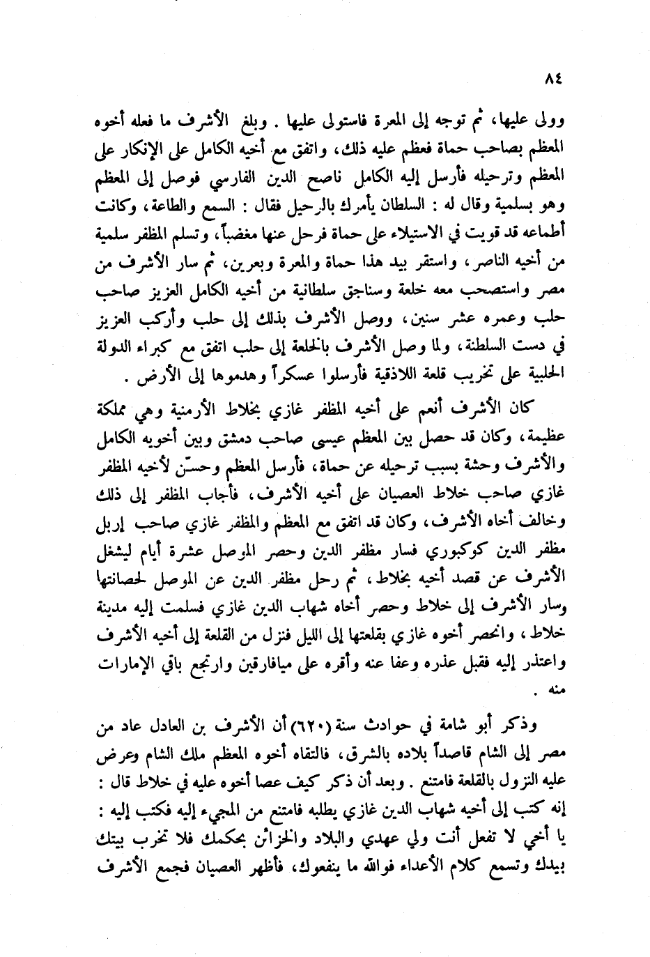 بالقلعة فامتنع. وبعد أن ذكر كيف عصا أخوه عليه في خلاط قال: إنه كتب إلى أخيه شهاب الدين غازي يطلبه فامتنع من المجيء إليه فكتب إليه: يا أخي لا تفعل أنت ولي عهدي والبلاد والخزائن بحكمك فلا تخرب بيتك بيدك وتسمع كلام الأعداء فوالله ما ينفعوك، فأظهر العصيان فجمع الأشرف