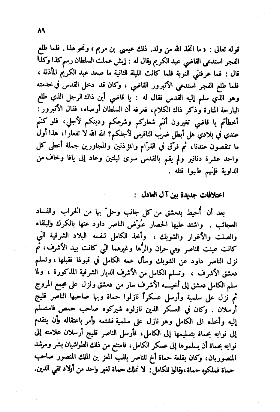 قوله تعالى: ما اتخذ الله من ولد. ذلك عيسى بن مريم ونحو هذا. فلما طلع الفجر استدعى القاضي عبد الكريم وقال له: إيش عملت السلطان رسم كذا وكذا قال: فما عرفتني النوبة فلما كانت الليلة الثانية ما صعد عبد الكريم المئذنة، فلما طلع الفجر استدعى الأنبرور القاضي، وكان قد دخل القدس في خدمته وهو الذي سلم إليه