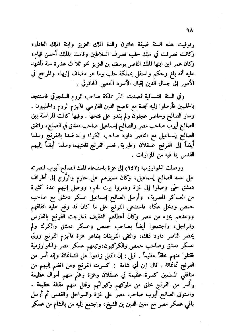 حمص وعسكر دمشق والكرك ولم يحضر الناصر داود ذلك، والتقى الفريقان بظاهر غزة فانهزم الفرنج وولى عسكر دمشق وصاحب حمص والكركيون، وتبعهم عسكر مصر والخوارزمية فقتلوا منهم خلقاً عظيماً. قيل: إن القتلى زادوا على الثمانمائة وإنه أسر من الفرنج ثمانمائة. قال ابن أبي شامة: كسرت الفرنج ومن انضم إليهم من منافقي المسلمين كسرة عظيمة في عسقلان وغزة وغنم منهم أموال عظيمة وأُسر من الفرنج خلق من ملوكهم وكبرائهم وقتل منهم مقتلة عظيمة. واستولى الصالح أيوب صاحب مصر على غزة والسواحل والقدس ثم أرسل باقي عسكر مصر مع معين الدين بن الشيخ، واجتمع إليه من بالشام من عسكر