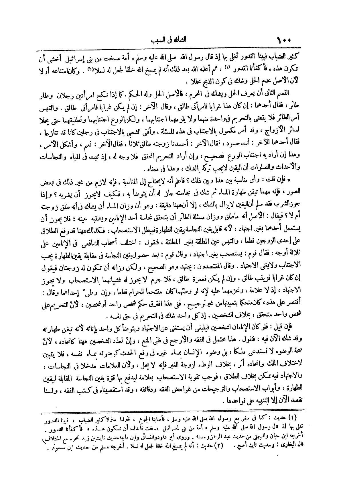 فإن قيل فلو كان الإناء أن لشخصين فينبغي أن يستغني عن الاجتهاد ويتوضأ كل واحد بإنائه لأنه تيقن طهارته وقد شك الآن فيه فنقول هذا محتمل في الفقه والأرجح في ظني المنع وأن تعدد الشخصين ههنا كاتحاده لأن صحة الوضوء لا تستدعي ملكاً بل وضوء الإنسان بماء غيره في رفع الحدث كوضوئه بماء نفسه فلا يتبين لاختلاف الملك واتحاده أثر بخلاف الوطء لزوجة الغير فإنه لا يحل ولأن للعلامات مدخلاً في النجاسات والاجتهاد فيه ممكن بخلاف الطلاق فوجب تقوية الاستصحاب بعلامة ليدفع بها قوة يقين النجاسة المقابلة ليقين الطهارة وأبواب الاستصحاب والترجيحات من غوامض الفقه ودقائقه وقد استقصيناه في كتب الفقه ولسنا نقصد الآن إلا التنبيه على قواعدها