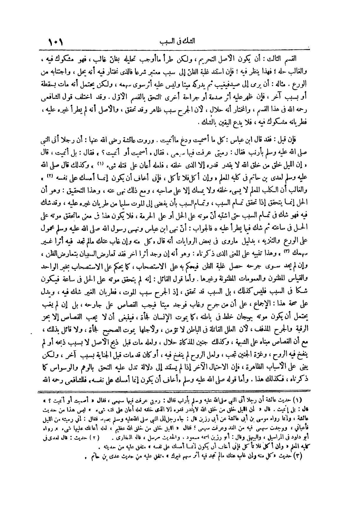 وأما قول القائل إنه لم يتحقق موته على الحل في ساعة فيكون شكاً في السبب فليس كذلك بل السبب قد تحقق إذ الجرح سبب الموت فطربان الغير شك فيه ويدل على صحة هذا الإجماع على أن من جرح وغاب فوجد ميتاً فيجب القصاص على جارحه بل إن لم يغب يحتمل أن يكون موته بيهجان خلط في باطنه كما يموت الإنسان فجأة فينبغي أن لا يجب القصاص إلا بحز الرقبة والجرح المذفف لأن العلل القاتلة في الباطن لا تؤمن ولأجلها يموت الصحيح فجأة ولا قائل بذلك مع أن القصاص مبناه على الشبهة وكذلك جنين المذكاة حلال ولعله مات قبل ذبح الأصل لا بسبب ذبحه أو لم ينفخ فيه الروح وغرة الجنين تجب ولعل الروح لم ينفخ فيه أو كان قد مات قبل الجناية بسبب آخر ولكن يبني على الأسباب الظاهرة فإن الاحتمال الآخر إذا لم يستند إلى دلالة تدل عليه التحق بالوهم والوسواس كما ذكرناه فكذلك هذا
