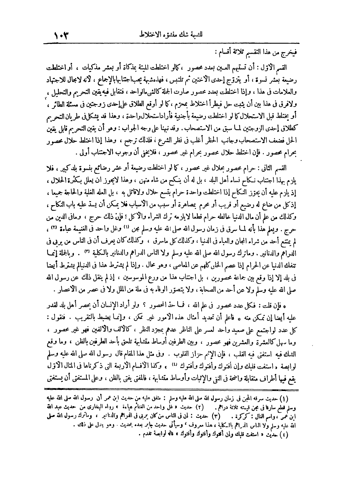 القسم الأول أن تستبهم العين بعدد محصور كما لو اختلطت الميتة بمذكاة أو بعشر مذكيات أو اختلطت رضيعة بعشر نسوة أو يتزوج إحدى الأختين ثم تلتبس فَهَذِهِ شُبْهَةٌ يَجِبُ اجْتِنَابُهَا بِالْإِجْمَاعِ لِأَنَّهُ لَا مَجَالَ لِلِاجْتِهَادِ وَالْعَلَامَاتِ فِي هَذَا وَإِذَا اخْتَلَطَتْ بِعَدَدٍ مَحْصُورٍ صَارَتِ الْجُمْلَةُ كَالشَّيْءِ الْوَاحِدِ فَتَقَابَلَ فيه يقين التحريم والتحليل ولا فرق في هذا بين أن يثبت حل فيطرأ اختلاط بمحرم كما لو أوقع الطلاق على إحدى زوجتين في مسئلة الطائر أو يختلط قبل الاستحلال كما لو اختلطت رضيعة بأجنبية فأراد استحلال واحدة وهذا قد يشكل في طريان التحريم كطلاق إحدى الزوجتين لما سبق من الاستصحاب