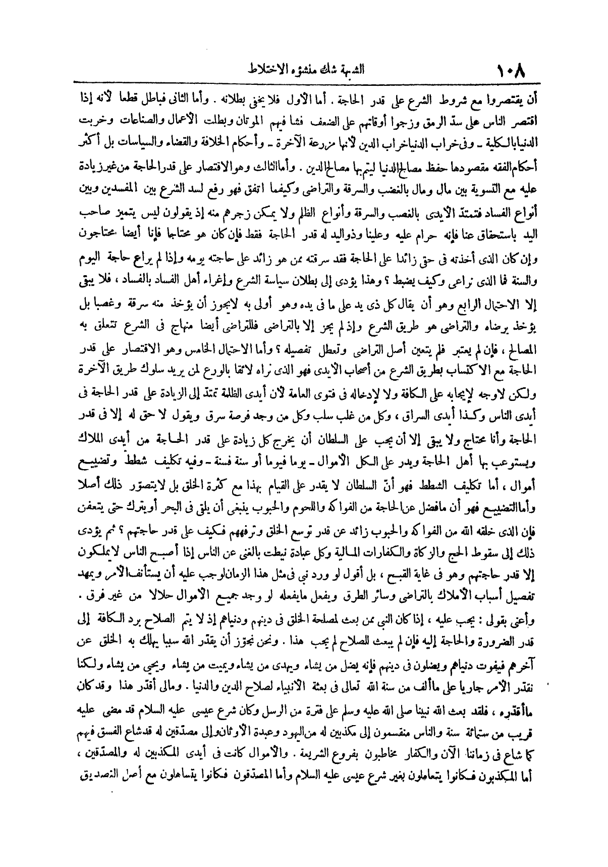 وأما الثالث وهو الاقتصار على قدر الحاجة من غير زيادة عليه مع التسوية بين مال ومال بالغضب والسرقة والتراضي وكيفما اتفق فهو رفع لسد الشرع بين المفسدين وبين أنواع الفساد فتمتد الأيدي بالغصب والسرقة وأنواع الظلم ولا يمكن زجرهم منه إذ يقولون ليس يتميز صاحب اليد باستحقاق عنا فإنه حرام عليه وعلينا وذو اليد له قدر الحاجة فقط فإن كان هو محتاجا فإنا أيضاً محتاجون وإن كان الذي أخذته في حقي زائداً على الحاجة فقد سرقته ممن هو زائد على حاجته يومه وإذا لم يراع حاجة اليوم والسنة فما الذي نراعي وكيف يضبط وهذا يؤدي إلى بطلان سياسة الشرع وإغراء أهل الفساد بالفساد فلا يبقى إلا الاحتمال الرابع وهو أن يقال كل ذي يد على ما في يده وهو أولى به لا يجوز أن يؤخذ منه سرقة وغصبا بل يؤخذ برضاه والتراضي هو طريق الشرع وإذ لم يجز إلا بالتراضي فللتراضي أيضاً منهاج في الشرع تتعلق به المصالح فإن لم يعتبر فلم يتعين أصل التراضي وتعطل تفصيله وأما الاحتمال الخامس وهو الاقتصار على قدر الحاجة مع الاكتساب بطريق الشرع من أصحاب الأيدي فهو الذي نراه لائقاً بالورع لمن يريد سلوك طريق الآخر ولكن لا وجه لإيجابه على الكافة ولا لإدخاله في فتوى العامة لأن أيدي الظلمة تمتد إلى الزيادة على قدر الحاجة في أيدي الناس وكذا أيدي السراق وكل من غلب سلب وكل من وجد فرصة سرق ويقول لا حق له إلا في قدر الحاجة وأنا محتاج ولا يبقى إلا أن يجب على السلطان أن يخرج كل زيادة على قدر الحاجة من أيدي الملاك ويستوعب بها أهل الحاجة ويدر على الكل الأموال يوما فيوما أو سنة فسنة وفيه تكليف شطط وتضييع أموال أما تكليف الشطط فهو أن السلطان لا يقدر على القيام بهذا مع كثرة الخلق بل لا يتصور ذلك أصلاً وأما التضييع فهو أن ما فضل عن الحاجة من الفواكه واللحوم والحبوب ينبغي أن يلقى في البحر أو يترك حتى يتعفن فإن الذي خلقه الله من الفواكه والحبوب زائد عن قدر توسع الخلق وترفههم فكيف على قدر حاجتهم ثم يؤدي ذلك إلى سقوط الحج والزكاة والكفارات المالية وكل عبادة نيطت بالغنى عن الناس إذا أصبح الناس لا يملكون إلا قدر حاجتهم وهو في غاية القبح بل أقول لو ورد نبي في مثل هذا الزمان لوجب عليه أن يستأنف الأمر ويمهد تفصيل أسباب الأملاك بالتراضي وسائر الطرق ويفعل ما يفعله لو وجد جميع الأموال حلالاً من غير فرق