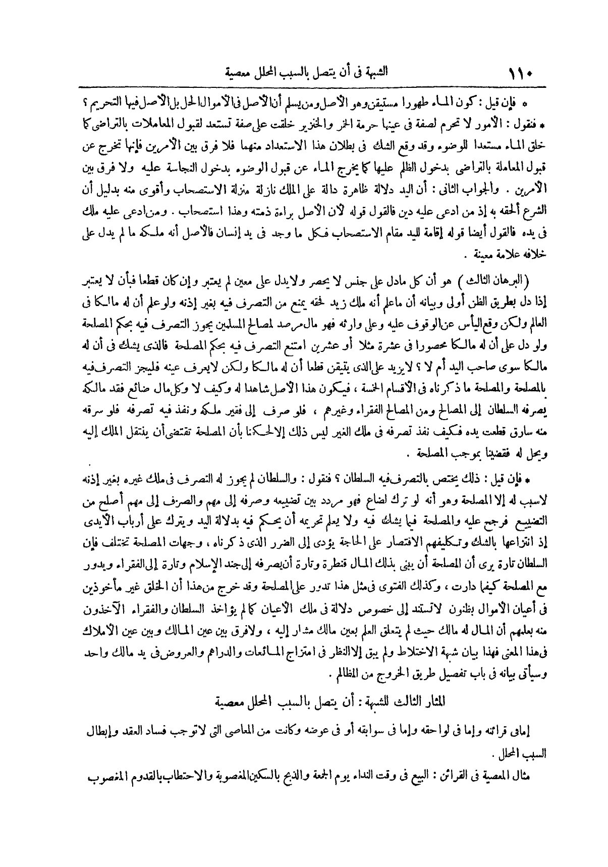 فنقول: والسلطان لم يجوز له التصرف في ملك غيره بغير إذنه لا سبب له إلا المصلحة وهو أنه لو ترك لضاع فهو مردد بين تضييعه وصرفه إلى مهم والصرف إلى مهم أصلح من التضييع فرجح عليه والمصلحة فيما يشك فيه ولا يعلم تحريمه أن يحكم فيه بدلالة اليد ويترك على أرباب الأيدي إذ انتزاعها بالشك وتكليفهم الاقتصار على الحاجة يؤدي إلى الضرر الذي ذكرناه وجهات المصلحة تختلف فإن السلطان تارة يرى أن المصلحة أن يبني بذلك المال قنطرة وتارة أن يصرفه إلى جند الإسلام وتارة إلى الفقراء ويدور مع المصلحة كيفما دارت وكذلك الفتوى في مثل هذا تدور على المصلحة وقد خرج من هذا أن الخلق غير مأخوذين في أعيان الأموال بظنون لا تستند إلى خصوص دلالة في ملك الأعيان كما لم يؤاخذ السلطان والفقراء الآخذون منه بعلمهم أن المال له مالك حيث لم يتعلق العلم بعين مالك مشار إليه ولا فرق بين عين المالك وبين عين الأملاك في هذا المعنى فهذا بيان شبهة الاختلاط ولم يبق إلا النظر في امتزاج المائعات والدراهم والعروض في يد مالك واحد وسيأتي بيانه في باب تفصيل طريق الخروج من المظالم الْمَثَارُ الثَّالِثُ لِلشُّبْهَةِ أَنْ يَتَّصِلَ بِالسَّبَبِ الْمُحَلِّلِ معصية