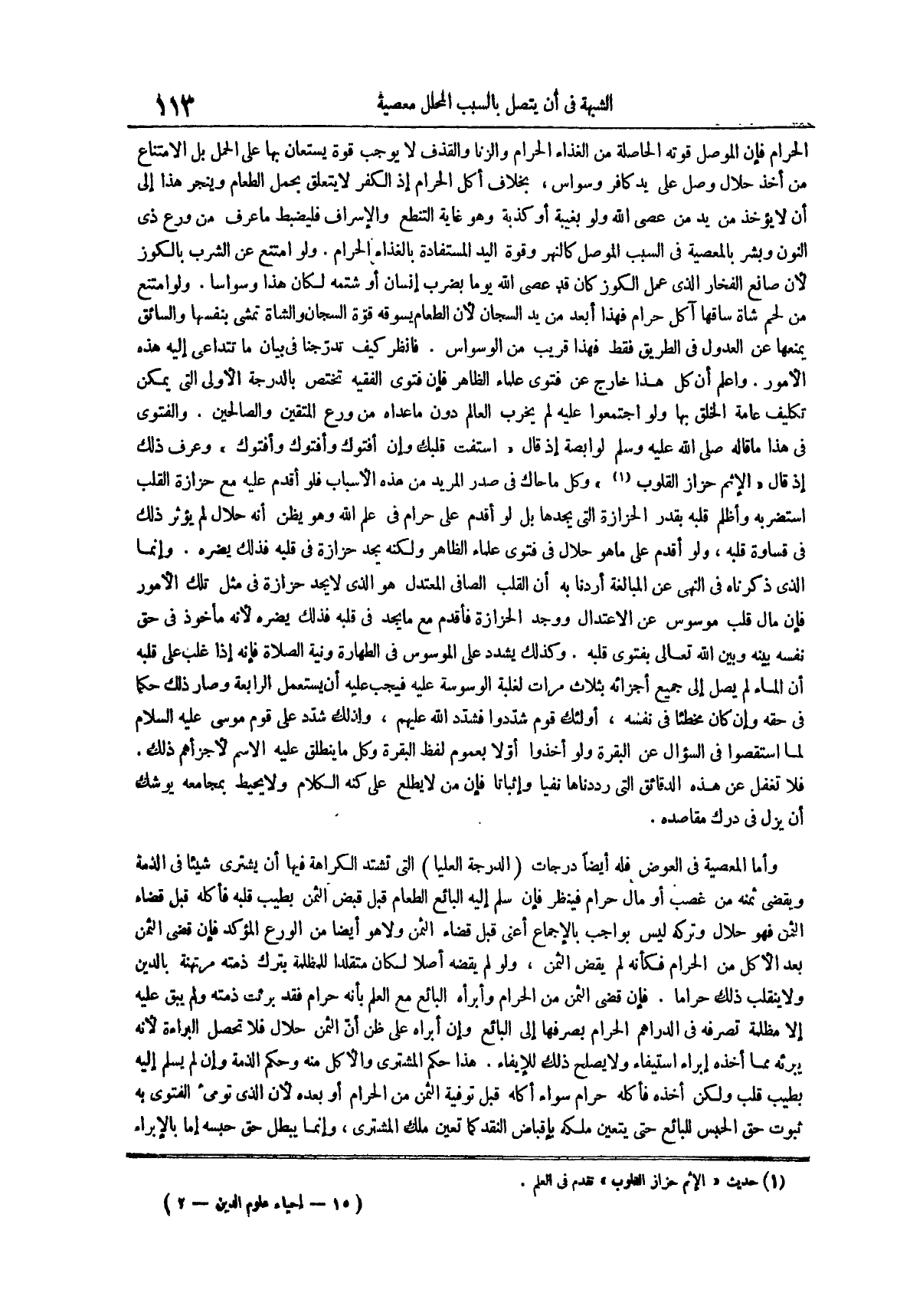 الحرام فإن الموصل قوته الحاصلة من الغذاء الحرام والزنا والقذف لا يوجب قوة يستعان بها على الحمل بل الامتناع من أخذ حلال وصل على يد كافر وسواس بخلاف أكل الحرام إذ الكفر لا يتعلق بحمل الطعام وينجر هذا إلى أن لا يؤخذ من يد من عصى الله ولو بغيبة أو كذبة وهو غاية التنطع والإسراف فليضبط ما عرف من ورع ذي النون وبشر بالمعصية في السبب الموصل كالنهر وقوة اليد المستفادة بالغذاء الحرام