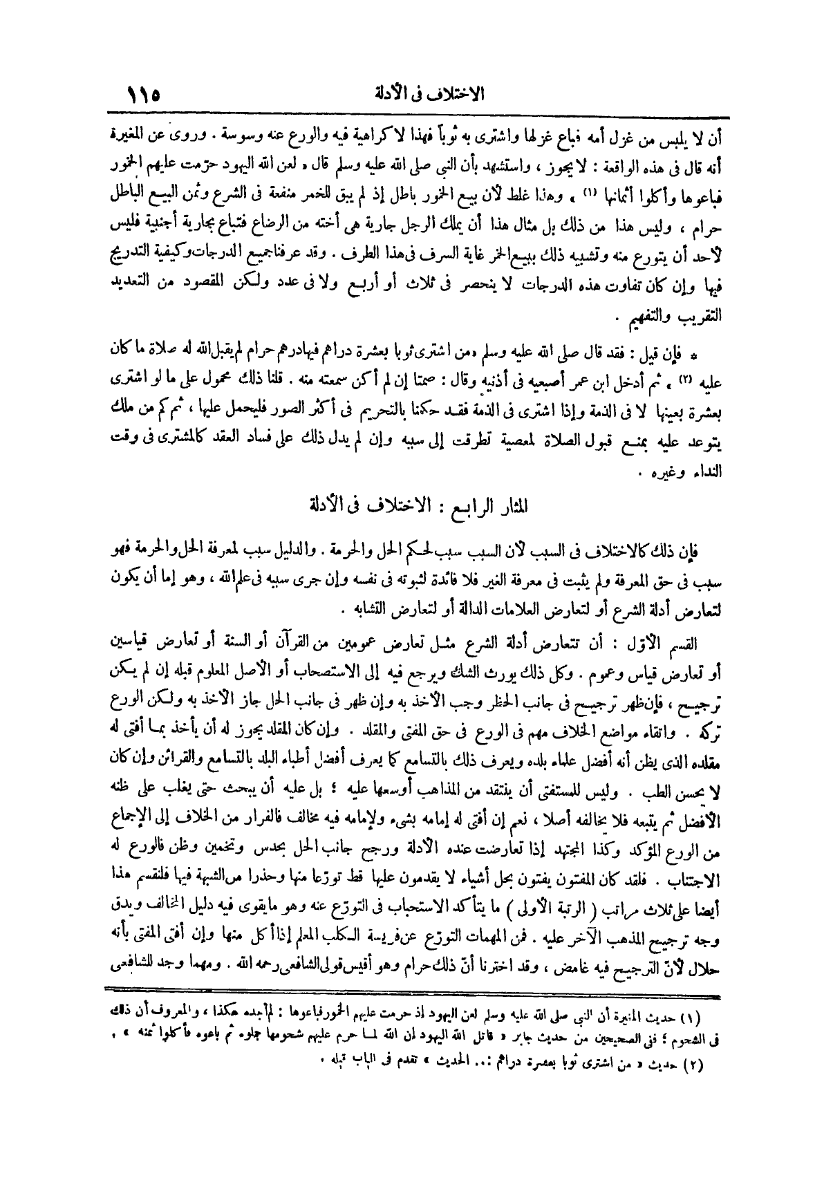 ثم أدخل ابن عمر أصبعيه في أذنيه وقال: صمتاً إن لم أكن سمعته منه قلنا ذلك محمول على ما لو أشترى بعشرة بعينها لا في الذمة وإذا اشترى في الذمة فقد حكمنا بالتحريم في أكثر الصور فليحمل عليها ثم كم من ملك يتوعد عليه بمنع قبول الصلاة لمعصية تطرقت إلى سببه وإن لم يدل ذلك على فساد العقد كالمتشري في الوقت النداء وغيره المثار الرابع الاختلاف في الأدلة