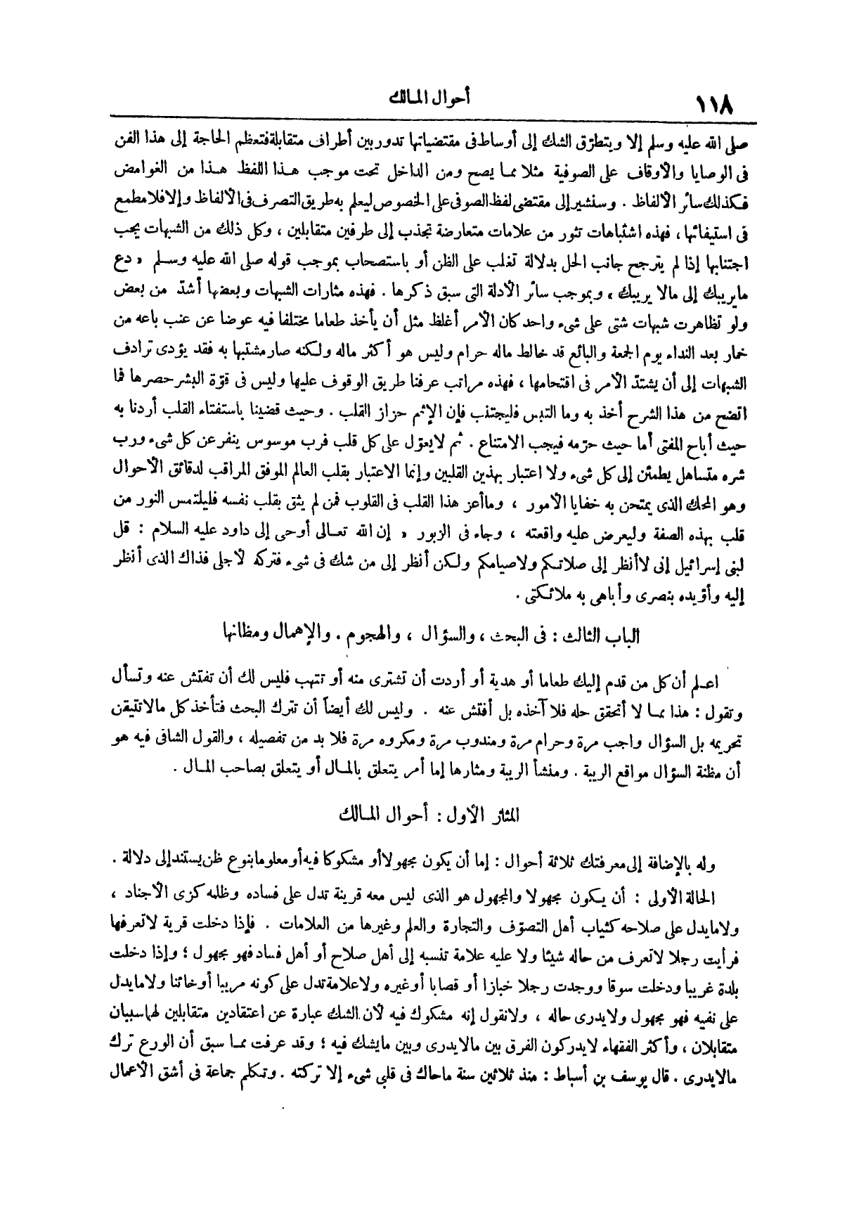 وَلَيْسَ لَكَ أيضاً أن تترك البحث فتأخذ كل ما لا تتيقن تحريمه بل السؤال واجب مرة وحرام مرة ومندوب مرة ومكروه مرة فلا بد من تفصيله والقول الشافي فيه هو أن مظنة السؤال مواقع الريبة ومنشأ الريبة ومثارها إما أمر يتعلق بالمال أو يتعلق بصاحب المال المثار الأول: أحوال المالك
