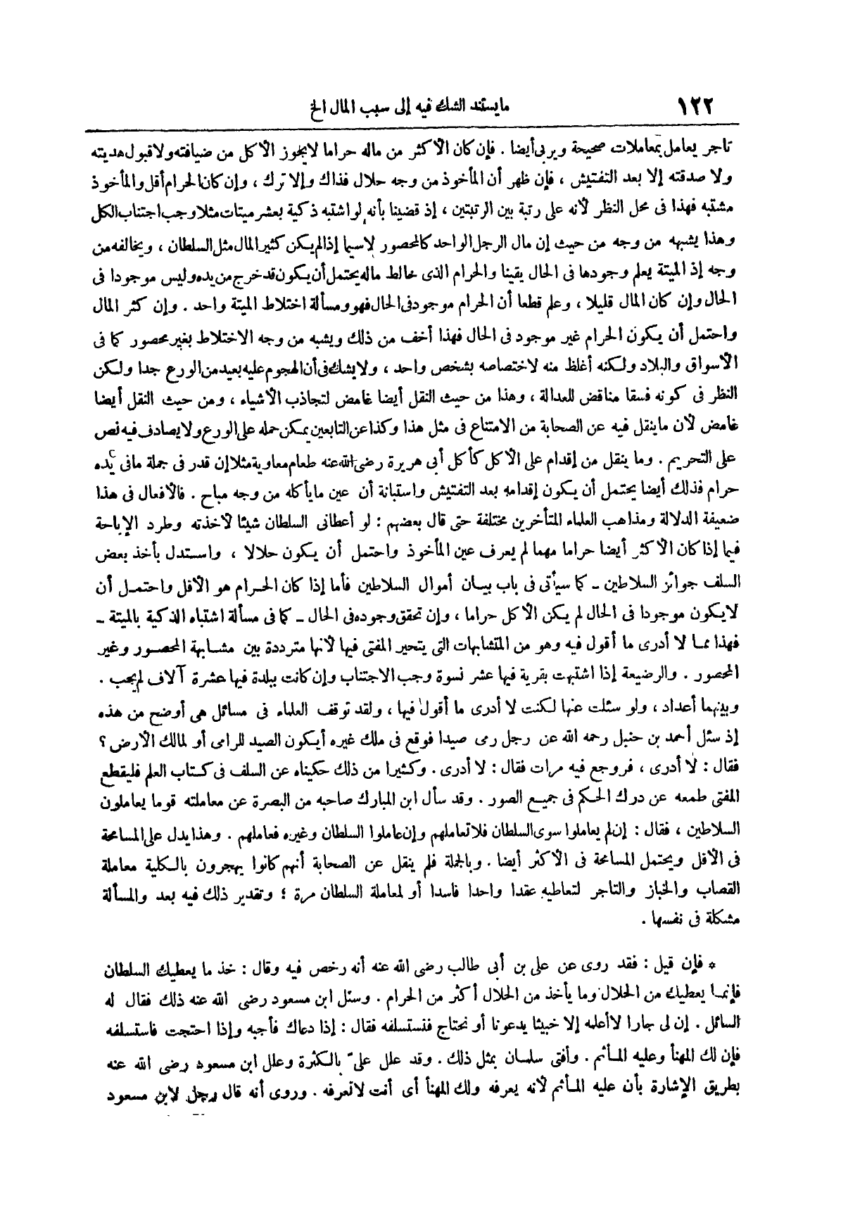 فإن قيل فقد روي عن عَلِيُّ بْنُ أَبِي طَالِبٍ رَضِيَ اللَّهُ عَنْهُ أنه رخص فيه وقال خذ ما يعطيك السلطان فإنما يعطيك من الحلال وما يأخذ من الحلال أكثر من الحرام وسئل ابن مسعود رضي الله عنه ذلك فقال له السائل إن لي جاراً لا أعلمه إلا خبيثا يدعونا أو نحتاج فنستسلفه فقال إذا دعاك فأجبه وإذا احتجت فاستسلفه فإن لك المهنأ وعليه المأثم وأفتي سلمان بمثل ذلك وقد علل علي الكثرة وعلل ابن مسعود رضي الله عنه بطريق الإشارة بأن عليه المأثم لأنه يعرفه ولك المهنأ أي أنت