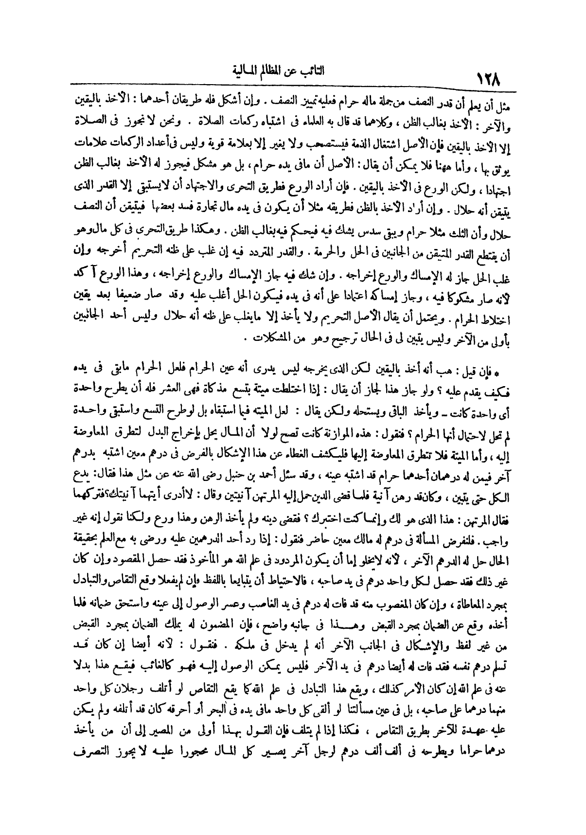 مِثْلَ أَنْ يَعْلَمَ أَنَّ قَدْرَ النِّصْفِ مِنْ جُمْلَةِ مَالِهِ حَرَامٌ فَعَلَيْهِ تَمْيِيزُ النِّصْفِ وَإِنْ شكل فله طريقان أحدهما الأخذ باليقين والآخر الأخذ بغالب الظن وكلاهما قد قال به العلماء في اشتباه ركعات الصلاة ونحن لا نجوز في الصلاة إلا الأخذ باليقين فإن الأصل اشتغال الذمة فيستصحب ولا يغير إلا بعلامة قوية وليس في أعداد الركعات علامات يوثق بها وأما ههنا فلا يمكن أن يقال الأصل أن ما في يده حرام بل هو مشكل فيجوز له الأخذ بغالب الظن اجتهاداً ولكن الورع في الأخذ باليقين فإن أراد الورع فطريق التحري والاجتهاد أن لا يَسْتَبْقِي إِلَّا الْقَدْرَ الَّذِي يَتَيَقَّنُ أَنَّهُ حَلَالٌ وإن أراد الأخذ بالظن فطريقه مثلاً أن يكون في يده مال تجارة فسد بعضها فيتيقن أن النصف حلال وأن الثلث مثلاً حرام ويبقى سدس يشك فيه فيحكم فيه بغالب الظن وهكذا طريق التحري في كل مال وهو أن يقتطع القدر المتيقن من الجانبين في الحل والحرمة والقدر المتردد فيه إن غلب على ظنه التحريم أخرجه وإن غلب الحل جاز له الإمساك والورع إخراجه وإن شك فيه جاز الإمساك والورع إخراجه وهذا الورع آكد لأنه صار مشكوكاً فيه وجاز إمساكه اعتماداً على أنه في يده فيكون الحل أغلب عليه وقد صار ضعيفاً بعد يقين اختلاط الحرام ويحتمل أن يقال الأصل التحريم ولا يأخذ إلا ما يغلب على ظنه أنه حلال وليس أحد الجانبين بأولى من الآخر وليس يتبين لي في الحال ترجيح وهو من المشكلات