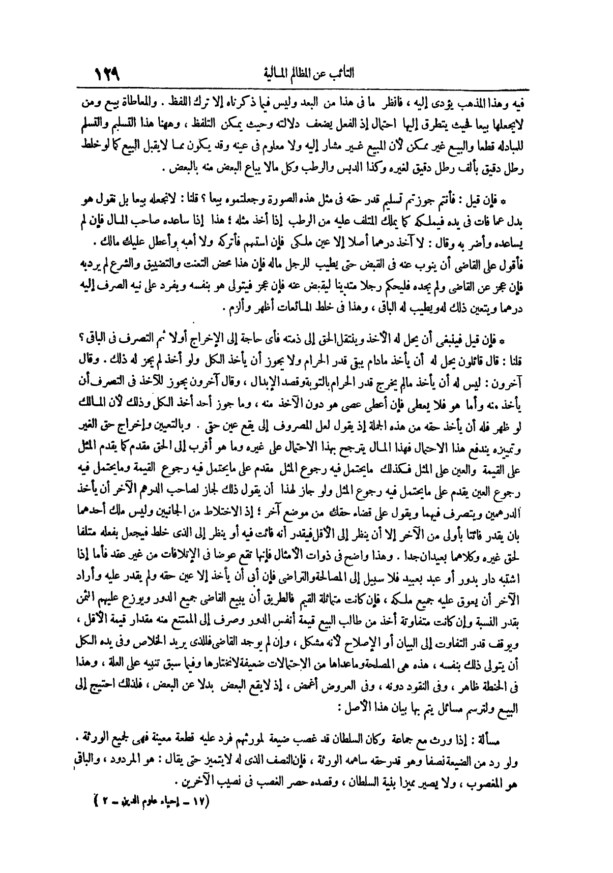 فإن قيل فينبغي أن يحل له الأخذ وينتقل الحق إلى ذمته فأي حاجة إلى الإخراج أولاً ثم التصرف في الباقي قلنا قال قائلون يحل له أن يأخذ ما دام يبقى قدر الحرام ولا يجوز أن يأخذ الكل ولو أخذ لم يجز له ذلك وقال آخرون ليس له أن يأخذ ما لم يخرج قدر الحرام بالتوبة وقصد الإبدال وقال آخرون يجوز للآخذ في التصرف أن يأخذ منه وأما هو فلا يعطي فإن أعطى عصى هو دون الآخذ منه وما جوز أحد أخذ الكل وذلك لأن المالك لو ظهر فله أن يأخذ حقه من هذه الجملة إذ يقول لعل المصروف إلي يقع عين حقي وبالتعيين وإخراج حق الغير وتمييزه يندفع هذا الاحتمال فهذا المال يترجح بهذا الاحتمال على غيره وما هو أقرب إلى الحق مقدم كما يقدم المثل على القيمة والعين على المثل فكذلك ما يحتمل فيه رجوع المثل مقدم على ما يحتمل فيه رجوع القيمة وما يحتمل فيه رجوع العين يقدم على ما يحتمل فيه رجوع المثل ولو جاز لهذا أن يقول ذلك لجاز لصاحب الدرهم الآخر أن يأخذ الدرهمين ويتصرف فيهما ويقول على قضاء حقك من موضع آخر إذ الاختلاط من الجانبين وليس ملك أحدهما بأن يقدر فائتاً بأولى من الآخر إلا أن ينظر إلى الأقل فيقدر أنه فائت فيه أو ينظر إلى الذي خلط فيجعل بفعله متلفاً لحق غيره وكلاهما بعيدان جداً وهذا واضح في ذوات الأمثال فإنها تقع عوضاً في الإتلافات من غير عقد فأما إذا اشتبه دار بدور أو عبد بعبيد فلا سبيل إلى المصالحة والتراضي فإن أبى أن يأخذ إلا عين حقه ولم يقدر عليه وأراد الآخر أن يعوق عليه جميع ملكه فإن كانت متماثلة القيم فالطريق أن يبيع القاضي جميع الدور ويوزع عليهم الثمن بقدر النسبة وإن كانت متفاوتة أخذ من طالب البيع قيمة أنفس الدور وَصَرَفَ إِلَى الْمُمْتَنِعِ مِنْهُ مِقْدَارَ قِيمَةِ الْأَقَلِّ ويوقف قدر التفاوت إلى البيان أو الإصلاح لأنه مشكل وإن لم يوجد القاضي فللذي يريد الخلاص وفي يده الكل أن يتولى ذلك بنفسه هذه هي المصلحة وما عداها من الاحتمالات ضعيفة لا نختارها وفيما سبق تنبيه على العلة وهذا في الحنطة ظاهر وفي النقود دونه وفي العروض أغمض إذ لا يقع البعض بدلاً عن البعض فذلك احتيج إلى البيع ولترسم مسائل يتم بها البيان هذا الأصل