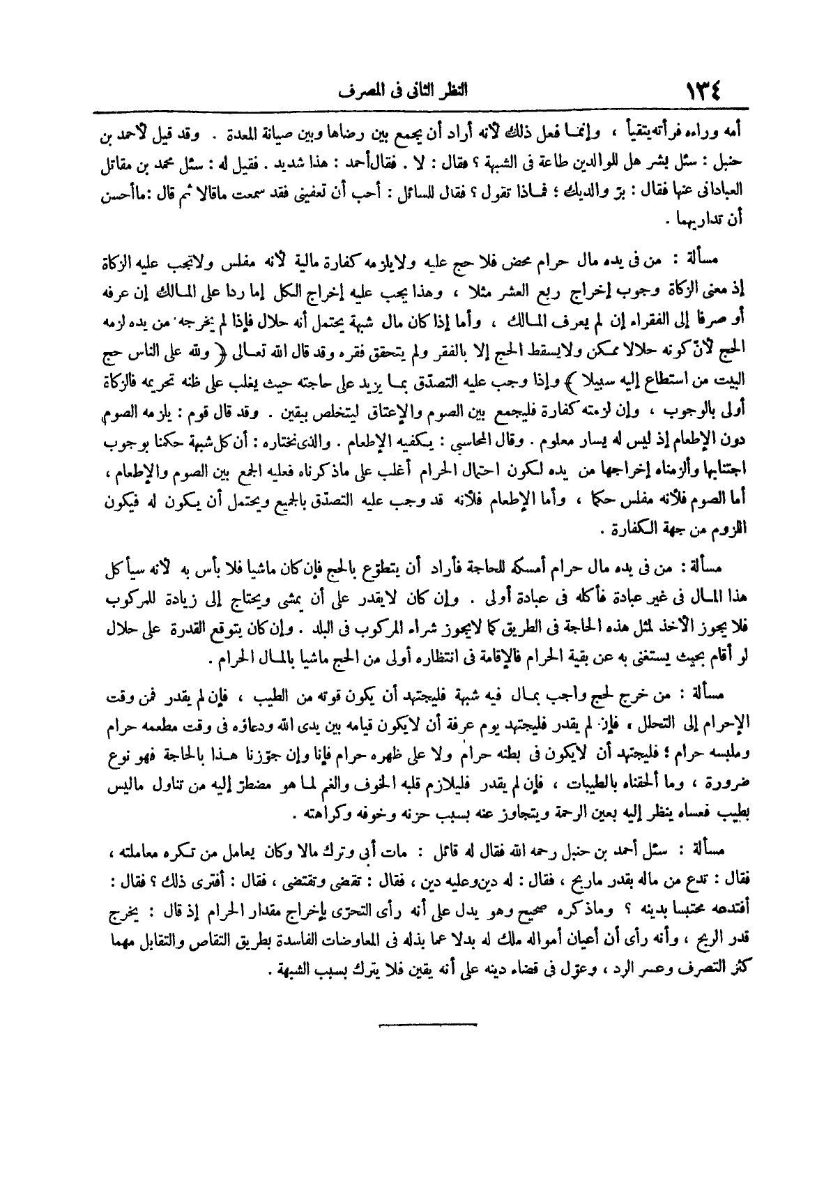 مسألة سئل أحمد بن حنبل رحمة الله فقال له قائل مات أبي وترك مالاً وكان يعامل من تكره معاملته فقال تدع من ماله بقدر ما ربح فقال له دين وعليه دين فقال تقضي وتقتضى فقال افترى ذلك فقال أفتدعه محتبساً بدينه وما ذكره صحيح وهو يدل على أنه رأى التحري بإخراج مقدار الحرام إذ قال يخرج قدر الربح وائه رأى أن أعيان أمواله ملك له بدلاً عما بذله في المعاوضات الفاسدة بطريق التقاص والتقابل مهما كثر التصرف وعسر الرد وعول في قضاء دينه على أنه يقين فلا يترك بسبب الشبهة