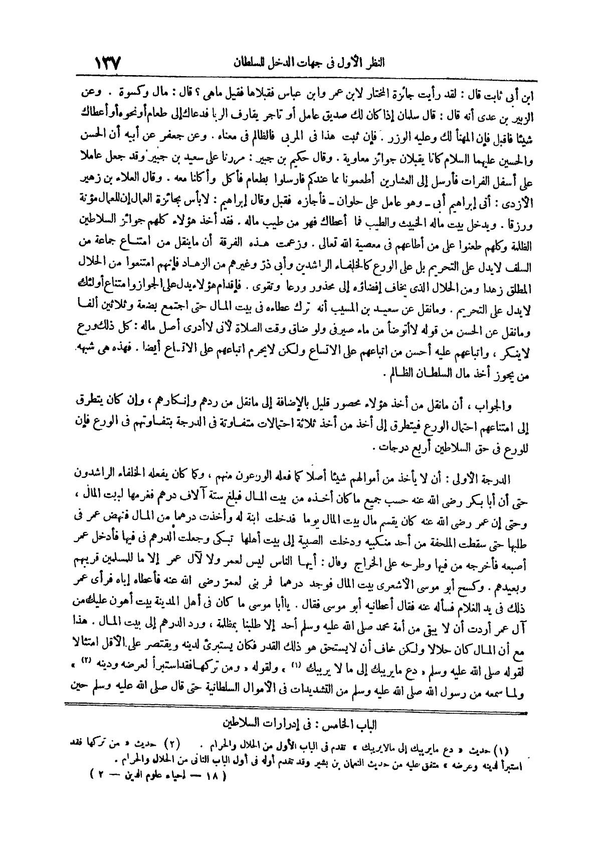 الدرجة الأولى أن لا يأخذ من أموالهم شيئاً أصلاً كما فعله الورعون منهم وكما كان يفعله الخلفاء الراشدون حتى أن أبا بكر رضي الله عنه حسب جميع ما كان أخذه من بيت المال فبلغ ستة آلاف درهم فغرمها لبيت المال وحتى أن عمر رضي الله عنه كان يقسم مال بيت المال يوماً فدخلت ابنة له وأخذت درهماً من المال فنهض عمر في طلبها حتى سقطت الملحفة من أحد منكبيه ودخلت الصبية إلى بيت أهلها تبكي وجعلت الدرهم في فيها فأدخل عمر إصبعه فأخرجه من فيها وطرحه على الخراج وقال أيها الناس ليس لعمر ولا لآل عمر إلا ما للمسلمين قريبهم وبعيدهم