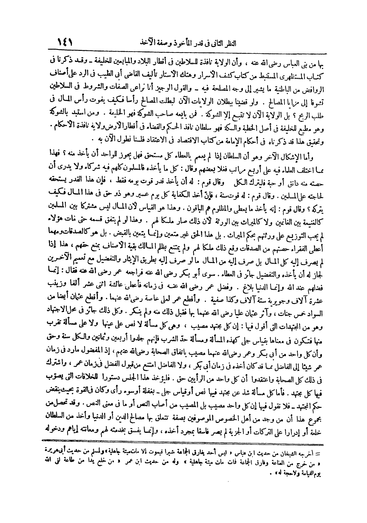 وأن الولاية نافذة للسلاطين في أقطار البلاد والمبايعين للخليفة وقد ذكرنا في كتاب المستظهري المستنبط من كتاب كشف الأسرار وهتك الأستار تأليف القاضي أبي الطيب في الرد على أصناف الروافض من الباطنية ما يشير إلى وجه المصلحة فيه والقول الوجيز أنا نراعي الصفات والشروط في السلاطين تشوفاً إلى مزايا المصالح