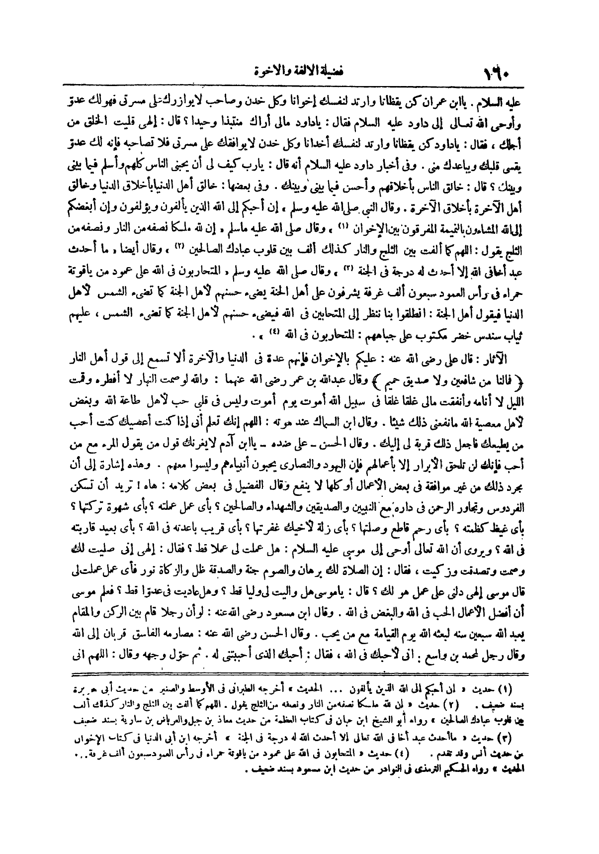 الآثار قال علي رضي الله عنه عليكم بالإخوان فإنهم عدة في الدنيا والآخرة ألا تسمع إلى قول أهل النار فمالنا من شافعين ولا صديق حميم وقال عبد الله بن عمر رضي الله عنهما والله لو صمت النهار لا أفطره وقمت الليل لا أنامه وأنفقت مالي غلقاً غلقاً في سبيل الله أموت يوم أموت وليس في قلبي حب لأهل طاعة الله وبغض لأهل معصية الله ما نفعني ذلك شيئاً