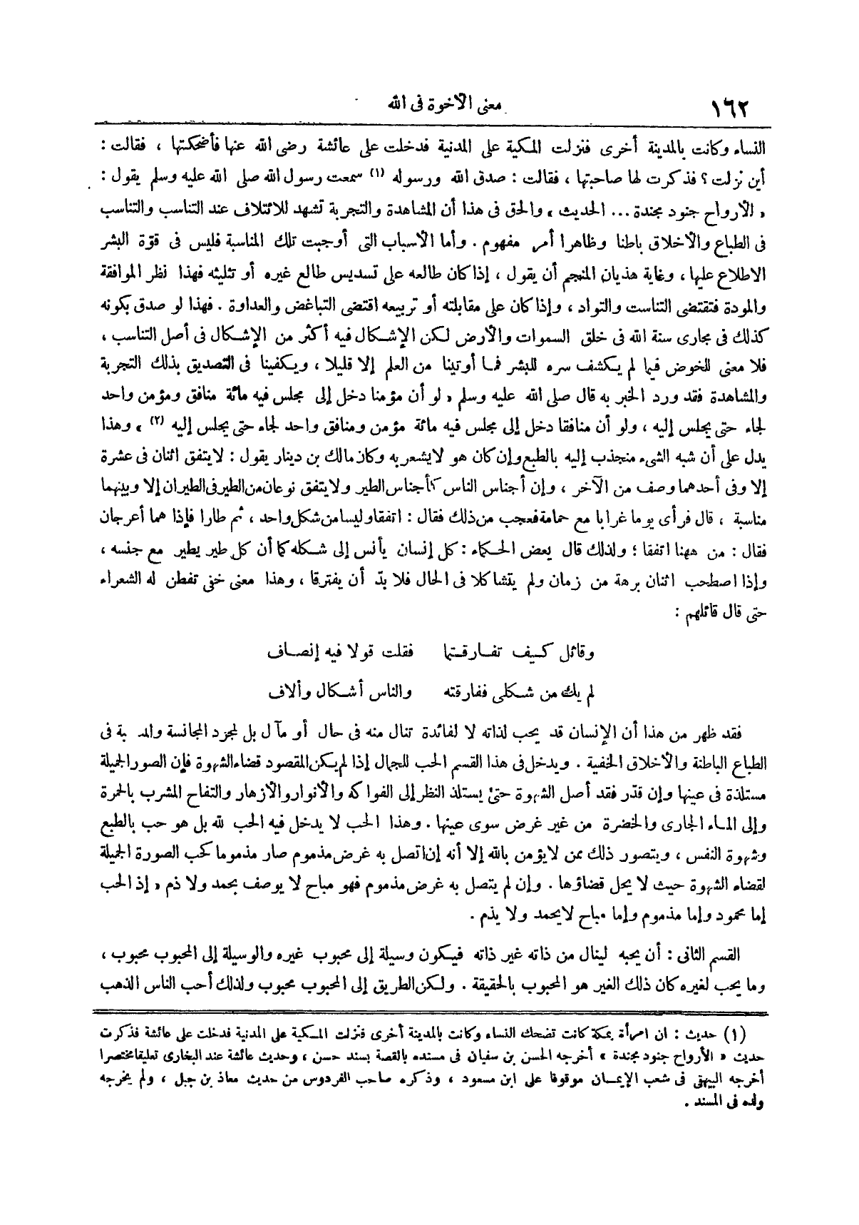 سَمِعْتُ رَسُولَ اللَّهِ صَلَّى اللَّهُ عَلَيْهِ وَسَلَّمَ يقول الأرواح جنود مجندة الحديث والحق في هذا أن المشاهدة والتجربة تشهد للائتلاف عند التناسب والتناسب في الطباع والأخلاق باطناً وظاهر أمر مفهوم