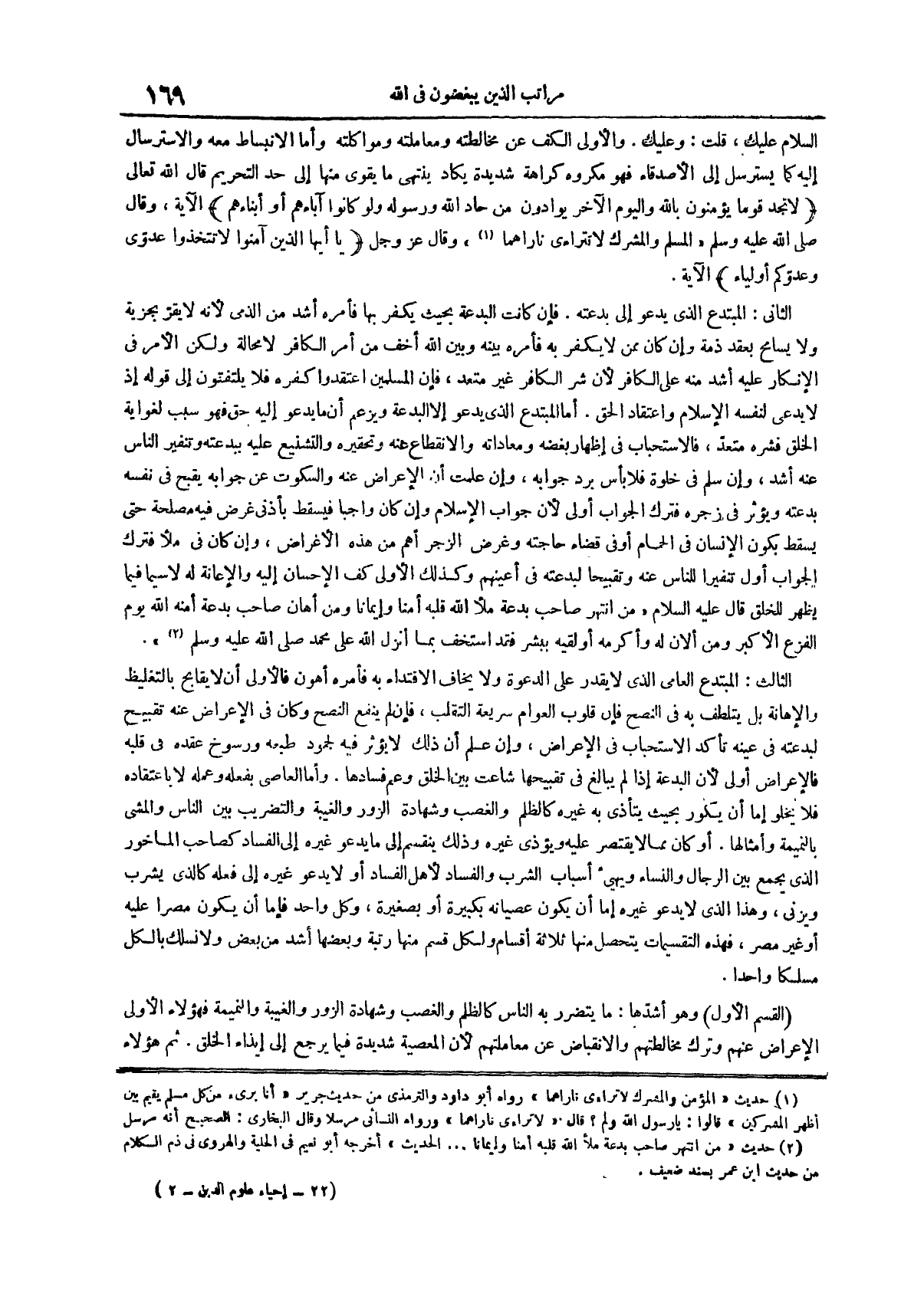 الثالث المبتدع العامي الذي لا يقدر على الدعوة ولا يخاف الاقتداء به فأمره أهون فالأولى أن لا يقابح بالتغليظ والإهانة بل يتلطف به في النصح فإن قلوب العوام سريعة التقلب فإن لم ينفع النصح وكان في الإعراض عنه تقبيح لبدعته في عينه تأكد الاستحباب في الإعراض وإن علم أن ذلك لا يؤثر فيه لجمود طبعه ورسوخ عقده في قلبه فالإعراض أولى لأن البدعة إذا لم يبالغ في تقبيحها شاعت بين الخلق وعم فسادها
