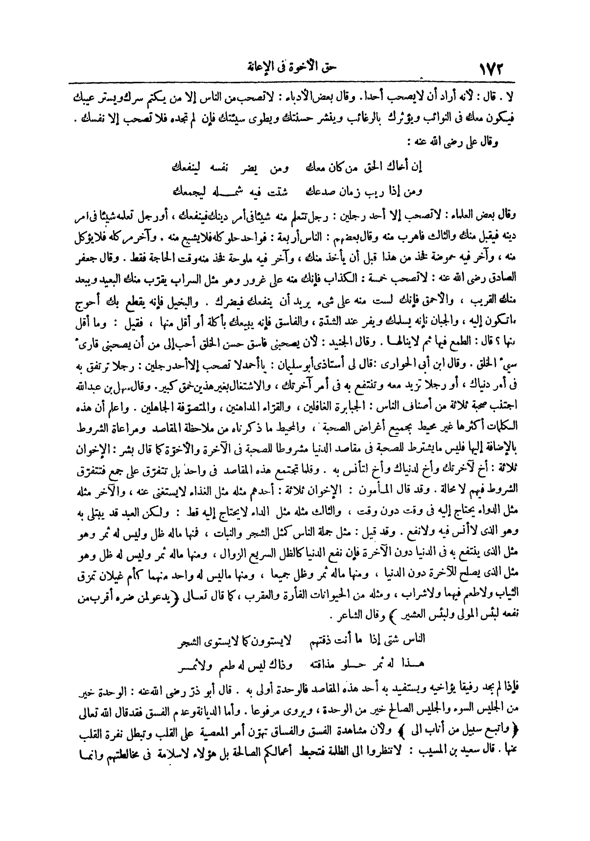 وقال بعض العلماء لا تصحب إلا أحد رجلين رجل تتعلم منه شيئاً في أمر دينك فينفعك أو رجل تعلمه شيئاً في أمر دينه فيقبل منك والثالث فاهرب منه وقال بعضهم الناس أربعة فواحد حلو كله فلا يشبع منه
