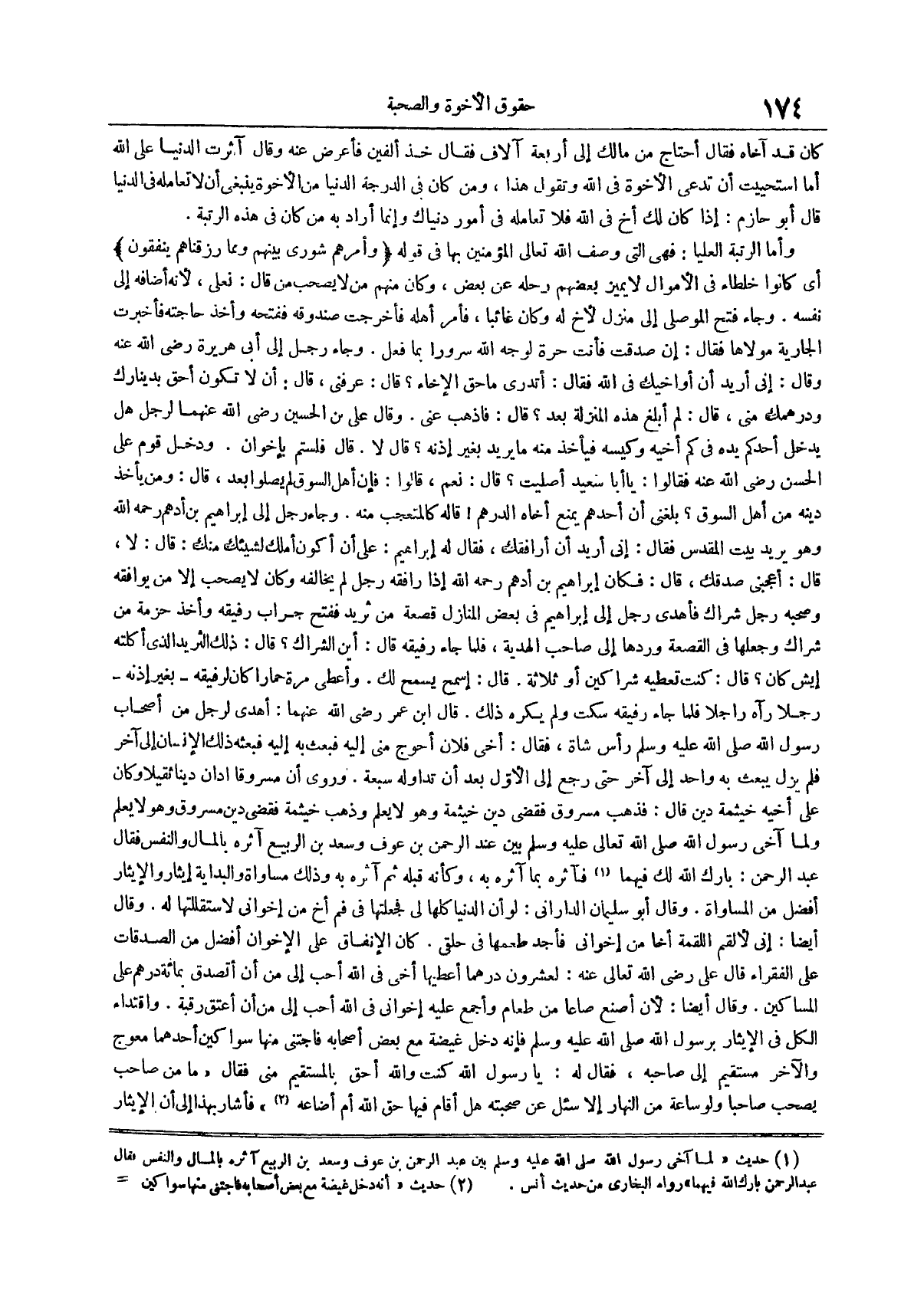 وروي أن مسروقاً أدان ديناً ثقيلاً وكان على أخيه خيثمة دين قال فذهب مسروق فقضى دين خيثمة وهو لا يعلم وذهب خيثمة فقضى دين مسروق وهو لا يعلم ولما آخى رسول الله صلى الله عليه وسلم بين عبد الرحمن بن عوف وسعد بن الربيع آثره بالمال والنفس فقال عبد الرحمن بارك الله لك فيهما (¬1)