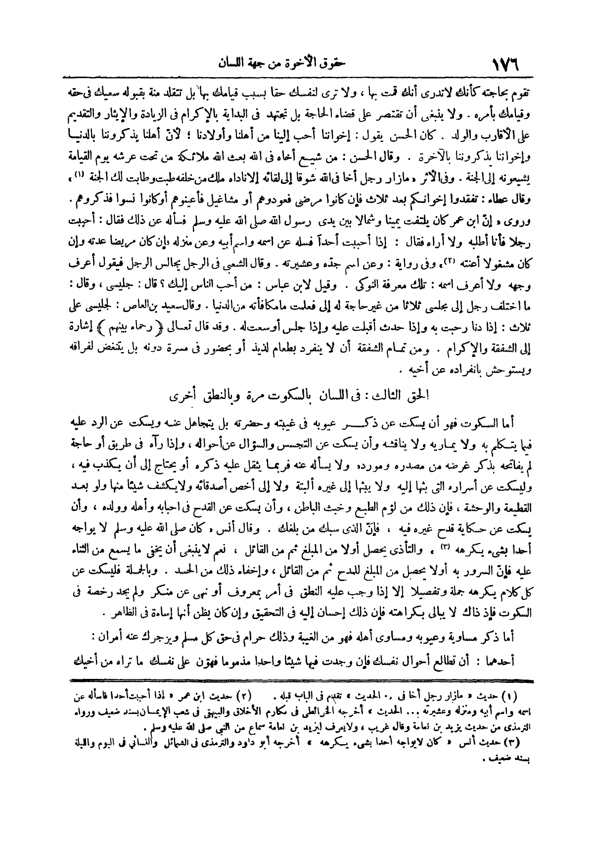 وَمِنْ تَمَامِ الشَّفَقَةِ أَنْ لَا يَنْفَرِدَ بِطَعَامٍ لَذِيذٍ أَوْ بِحُضُورٍ في مسرة دونه بل يتنغض لِفِرَاقِهِ وَيَسْتَوْحِشُ بِانْفِرَادِهِ عَنْ أَخِيهِ الْحَقُّ الثَّالِثُ في اللسان بِالسُّكُوتِ مَرَّةً وَبِالنُّطْقِ أُخْرَى