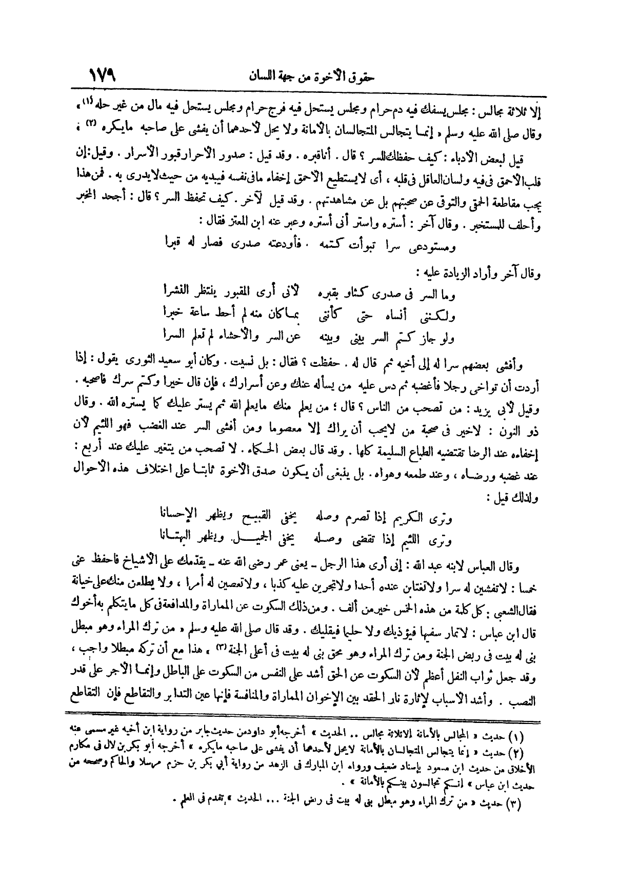 (¬2) حديث إنما يتجالس المتجالسان بالأمانة لا يَحِلُّ لِأَحَدِهِمَا أَنْ يُفْشِيَ عَلَى صَاحِبِهِ مَا يكره أخرجه أبو بكر بن لال في مكارم الأخلاق من حديث ابن مسعود بإسناد ضعيف ورواه ابن المبارك في الزهد من رواية أبي بكر بن حزم مرسلا والحاكم وصححه من حديث ابن عباس إنكم تجالسون بينكم بالأمانة
